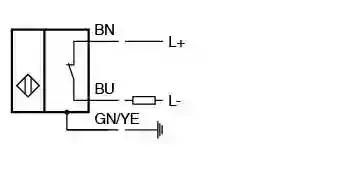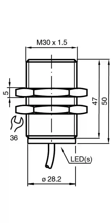 Inductive sensor. Switching function: Normally closed (NC), Output type: Two-wire, Installation: quasi flush, Output polarity: AC, Output type: 2-wire, Thread mold: M30, Construction type: Cylindrical, thread, Series: Cylindrical type, Type of voltage: AC, Connection type: cable, Housing material: brass, nickel-plated, Degree of protection: IP67, Material: PVC. Switching function: Normally closed (NC). Output type: Two-wire. Rated operating distance: 15 mm. Installation: quasi flush. Output polarity: AC. Assured operating distance: 0 … 12.15 mm. Actual operating distance: 13.5 … 16.5 mm. Reduction factor rAl: 0.33. Reduction factor rCu: 0.28. Reduction factor r304: 0.81. Output type: 2-wire. Operating voltage: 20 … 253 V. Switching frequency: 0 … 20 Hz. Hysteresis: 1 … 10 % typ. 5 %. Reverse polarity protection: reverse polarity tolerant. Voltage drop: 50 mA); < 8 V (IL 10 x cable diameterMaterialPVCColorgreyNumber of cores3Core cross section0.75 mm2LengthL2 m: . Wire end ferrules: yes. Cable diameter: 6.4 mm ± 0.2 mm. Bending radius: > 10 x cable diameter. Material: PVC. Color: grey. Number of cores: 3. Core cross section: 0.75 mm2. Length: 2 m. Dimensions: . Length50 mmDiameter30 mm: . Length: 50 mm. Diameter: 30 mm. Note: 1) In the temperature range below 0 °C, permissible operating voltage Ub 80…253 V Safety fuse ≤ 0.3 A (quick-blow) according to IEC 60127-2 Sheet 1 Recommendation: after a short circuit, check that the device is functioning correctly.