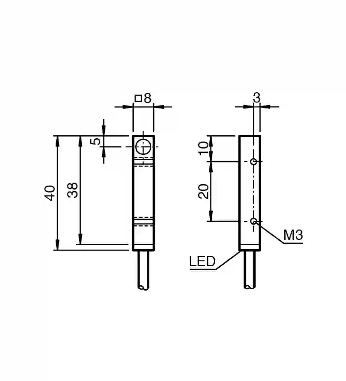 Inductive sensor. Switching function: Normally open (NO), Output type: PNP, Installation: flush, Output polarity: DC, Output type: 3-wire, Construction type: Rectangular, Series: Rectangular type, Type of voltage: DC, Connection type: cable, Housing material: brass, nickel-plated, Degree of protection: IP67, Material: PVC. Switching function: Normally open (NO). Output type: PNP. Rated operating distance: 1.5 mm. Installation: flush. Output polarity: DC. Assured operating distance: 0 … 1.215 mm. Reduction factor rAl: 0.45. Reduction factor rCu: 0.35. Reduction factor r304: 0.75. Output type: 3-wire. Operating voltage: 10 … 30 V. Switching frequency: 0 … 1500 Hz. Hysteresis: typ. 3 %. Reverse polarity protection: reverse polarity protected. Short-circuit protection: pulsing. Voltage drop: ≤ 3 V. Operating current: 0 … 100 mA. Off-state current: 0 … 0.5 mA typ.. No-load supply current: ≤ 15 mA. Time delay before availability: ≤ 20 ms. Switching state indicator: LED, yellow. MTTFd: 1528 a. Mission Time (TM): 20 a. Diagnostic Coverage (DC): 0 %. Standard conformity: . StandardsEN IEC 60947-5-2: . Standards: EN IEC 60947-5-2. UL approval: cULus Listed Load Type: General Purpose Circuitry: Class 2 Power Source Enclosure Type Rating: Type 1 Supply/Switching Voltage: 30 V DC Output Switching Current: 100 mA. CCC approval: CCC approval / marking not required for products rated ≤36 V. Ambient temperature: -25 … 70 °C (-13 … 158 °F). Connection type: cable. Housing material: brass, nickel-plated. Sensing face: PBT. Degree of protection: IP67. Cable: . Wire end ferrulesyesCable diameter3 mm + 0.3 mmBending radius> 10 x cable diameterMaterialPVCColorgreyNumber of cores3Core cross section0.14 mm2LengthL5 m: . Wire end ferrules: yes. Cable diameter: 3 mm + 0.3 mm. Bending radius: > 10 x cable diameter. Material: PVC. Color: grey. Number of cores: 3. Core cross section: 0.14 mm2. Length: 5 m. Mass: 13.5 g. Dimensions: . Height8 mmWidth8 mmLength40 mm: . Height: 8 mm. Width: 8 mm. Length: 40 mm