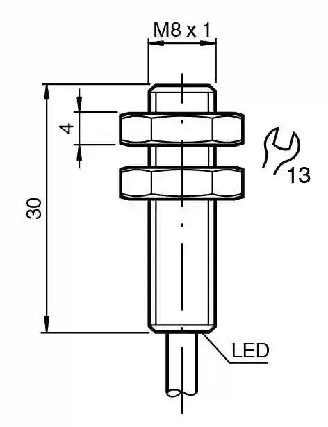 Inductive sensor. Extended temperature range, Switching function: Normally open (NO), Output type: PNP, Installation: flush, Output polarity: DC, Output type: 3-wire, Thread mold: M8, Construction type: Cylindrical, thread, Series: Cylindrical type, Type of voltage: DC, Connection type: cable, Housing material: brass, nickel-plated, Degree of protection: IP65 / IP66 / IP67, Material: PUR. Switching function: Normally open (NO). Output type: PNP. Rated operating distance: 2 mm. Installation: flush. Output polarity: DC. Assured operating distance: 0 … 1.62 mm. Actuating element: mild steel, e. g. 1.0037, SR235JR (formerly St37-2) 8 mm x 8 mm x 1 mm. Reduction factor rAl: 0.4. Reduction factor rCu: 0.3. Reduction factor r304: 0.75. Reduction factor rBrass: 0.45. Output type: 3-wire. Operating voltage: 5 … 30 V. Switching frequency: 0 … 6000 Hz. Hysteresis: typ. 5%. Reverse polarity protection: reverse polarity protected. Short-circuit protection: pulsing. Voltage drop: ≤ 1.5 V. Operating current: 0 … 100 mA. Off-state current: 0 … 0.2 mA. No-load supply current: ≤ 10 mA. Time delay before availability: ≤ 100 ms. Switching state indicator: LED, yellow. MTTFd: 960 a. Mission Time (TM): 20 a. Diagnostic Coverage (DC): 0 %. Standard conformity: . StandardsEN IEC 60947-5-2: . Standards: EN IEC 60947-5-2. UL approval: cULus Listed Load Type: General Purpose Circuitry: Class 2 Power Source Enclosure Type Rating: Type 1 Supply/Switching Voltage: 30 V DC Output Switching Current: 100 mA. CCC approval: CCC approval / marking not required for products rated ≤36 V. Ambient temperature: -40 … 85 °C (-40 … 185 °F). Storage temperature: -40 … 85 °C (-40 … 185 °F). Connection type: cable. Housing material: brass, nickel-plated. Sensing face: LCP. Degree of protection: IP65 / IP66 / IP67. Cable: . Cable diameter3.3 mm ± 0.15 mmBending radius> 10 x cable diameterMaterialPURColorblackNumber of cores3Core cross section0.14 mm2LengthL5 m: . Cable diameter: 3.3 mm ± 0.15 mm. Bending radius: > 10 x cable diameter. Material: PUR. Color: black. Number of cores: 3. Core cross section: 0.14 mm2. Length: 5 m. Dimensions: . Length30 mmDiameter8 mm: . Length: 30 mm. Diameter: 8 mm. Scope of delivery: 2 self locking nuts in scope of delivery Supplied with 2 toothed lock washers