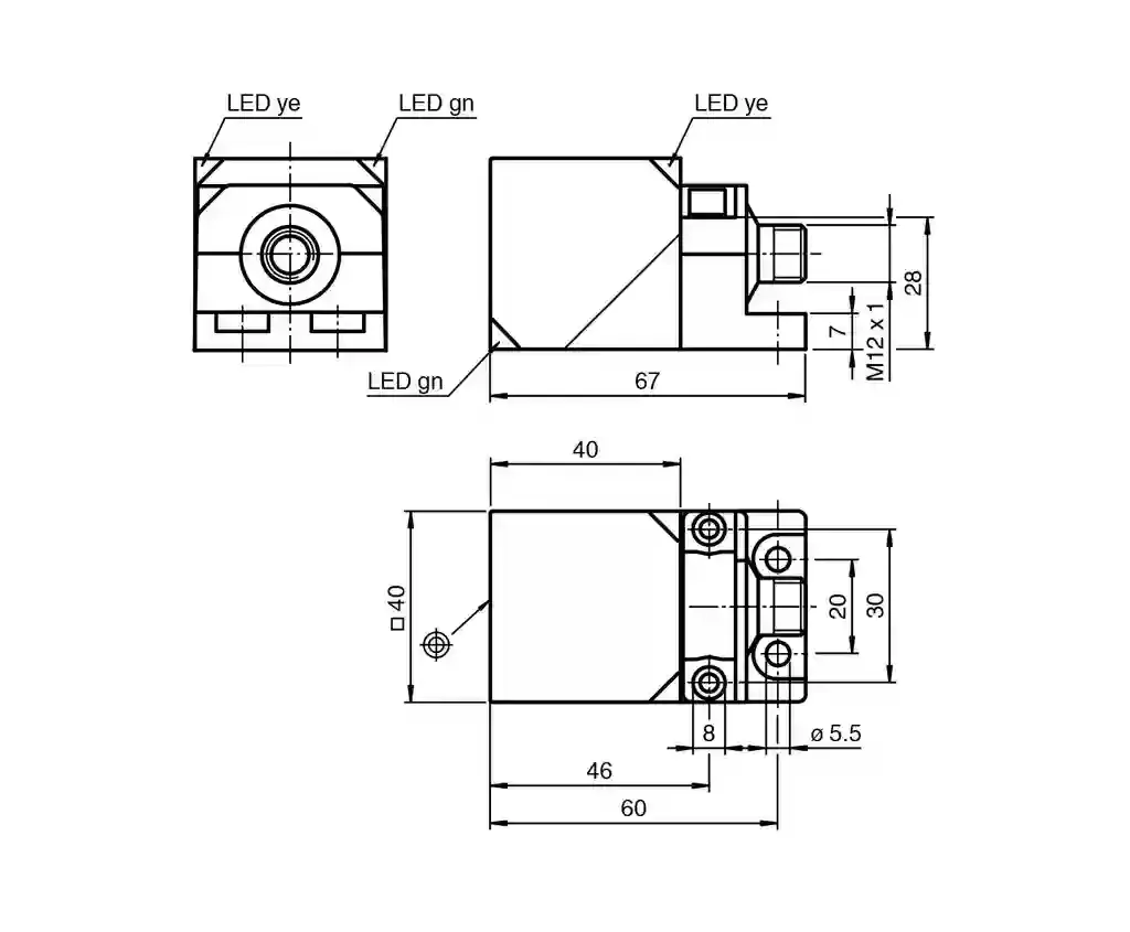 Inductive sensor. Switching function: Normally open (NO), Output type: PNP, Installation: flush, Output polarity: DC, Output type: 3-wire, Construction type: VariKont L ®, Series: VariKont L ®, Operating voltage: 10 … 30 V DC, Type of voltage: DC, Connection type: Connector plug, Housing material: PA-GF35metal base Xylan coatedmetal mounting flange Xylan coated., Degree of protection: IP69K, Threading: M12 x 1. Switching function: Normally open (NO). Output type: PNP. Rated operating distance: 20 mm. Installation: flush. Output polarity: DC. Assured operating distance: 0 … 16.2 mm. Actual operating distance: 18 … 22 mm. Reduction factor rAl: 0.33. Reduction factor rCu: 0.31. Reduction factor r304: 0.74. Reduction factor rBrass: 0.41. Output type: 3-wire. Operating voltage: 10 … 30 V DC. Switching frequency: 0 … 440 Hz. Hysteresis: typ. 5 %. Reverse polarity protection: reverse polarity protected. Short-circuit protection: pulsing. Voltage drop: ≤ 2 V. Operating current: 0 … 200 mA. Off-state current: 0 … 0.5 mA. No-load supply current: ≤ 20 mA. Time delay before availability: 80 ms. Operating voltage indicator: LED, green. Switching state indicator: LED, yellow. MTTFd: 1289 a. Mission Time (TM): 20 a. Diagnostic Coverage (DC): 0 %. Standard conformity: . StandardsEN IEC 60947-5-2: . Standards: EN IEC 60947-5-2. Protection class: II. Rated insulation voltageUi253 VRated impulse withstand voltageUimp4000 V: Ui. Rated insulation voltage: 253 V. Rated impulse withstand voltage: 4000 V. UL approval: cULus Listed Load Type: General Purpose Circuitry: Class 2 Power Source Enclosure Type Rating: Type 1 Supply/Switching Voltage: 30 V DC Output Switching Current: 200 mA. CCC approval: CCC approval / marking not required for products rated ≤36 V. Ambient temperature: -25 … 85 °C (-13 … 185 °F). Storage temperature: -40 … 85 °C (-40 … 185 °F). Connection type: Connector plug. Housing material: PA-GF35metal base Xylan coatedmetal mounting flange Xylan coated.. Sensing face: PA-GF35. Degree of protection: IP69K. Connector: . ThreadingM12 x 1Number of pins4: . Threading: M12 x 1. Number of pins: 4. Mass: 215 g. Dimensions: . Height40 mmWidth40 mmLength67 mm: . Height: 40 mm. Width: 40 mm. Length: 67 mm