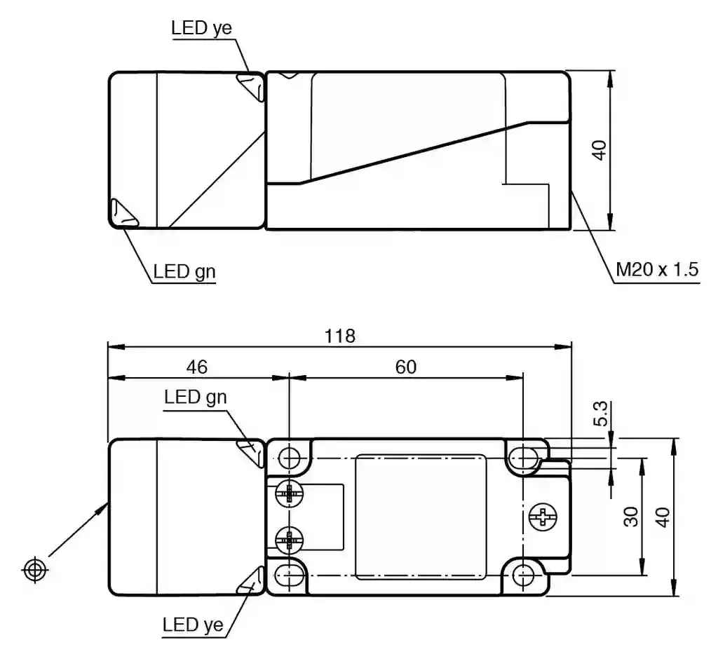 Inductive sensor. Switching function: Normally open (NO), Output type: NPN, Installation: flush, Output polarity: DC, Output type: 3-wire, Construction type: VariKont ®, Series: VariKont ®, Operating voltage: 10 … 30 V DC, Type of voltage: DC, Connection type: screw terminals, Housing material: PA/metal with epoxy powder coating, Degree of protection: IP68 / IP69K. Switching function: Normally open (NO). Output type: NPN. Rated operating distance: 20 mm. Installation: flush. Output polarity: DC. Assured operating distance: 0 … 16.2 mm. Actual operating distance: 18 … 22 mm typ. 20 mm. Reduction factor rAl: 0.33. Reduction factor rCu: 0.31. Reduction factor r304: 0.74. Reduction factor rBrass: 0.41. Output type: 3-wire. Operating voltage: 10 … 30 V DC. Switching frequency: 0 … 440 Hz. Hysteresis: typ. 5 %. Reverse polarity protection: reverse polarity protected. Short-circuit protection: pulsing. Voltage drop: ≤ 2 V. Operating current: 0 … 200 mA. Off-state current: 0 … 0.5 mA typ. 0.1 µA at 25 °C. No-load supply current: ≤ 20 mA. Time delay before availability: 80 ms. Operating voltage indicator: LED, green. Switching state indicator: LED, yellow. MTTFd: 1510 a. Mission Time (TM): 20 a. Diagnostic Coverage (DC): 0 %. Standard conformity: . StandardsEN IEC 60947-5-2: . Standards: EN IEC 60947-5-2. UL approval: cULus Listed Load Type: General Purpose Circuitry: Class 2 Power Source Enclosure Type Rating: Type 1 Supply/Switching Voltage: 30 V DC Output Switching Current: 200 mA. CCC approval: CCC approval / marking not required for products rated ≤36 V. Ambient temperature: -25 … 85 °C (-13 … 185 °F). Connection type: screw terminals. Information for connection: A maximum of two conductors with the same core cross section may be mounted on one terminal connection! tightening torque 1.2 Nm + 10 %. Core cross section: up to 2.5 mm2. Minimum core cross-sectionwithout wire end ferrules 0.5 mm2 , with connector sleeves 0.34 mm2Maximum core cross-sectionwithout wire end ferrules 2.5 mm2 , with connector sleeves 1.5 mm2: . Minimum core cross-section: without wire end ferrules 0.5 mm2 , with connector sleeves 0.34 mm2. Maximum core cross-section: without wire end ferrules 2.5 mm2 , with connector sleeves 1.5 mm2. Housing material: PA/metal with epoxy powder coating. Sensing face: PA. Housing base: plastic. Degree of protection: IP68 / IP69K. Mass: 225 g. Dimensions: . Height40 mmWidth40 mmLength118 mm: . Height: 40 mm. Width: 40 mm. Length: 118 mm. Note: Tightening torque: 1.8 Nm (housing)