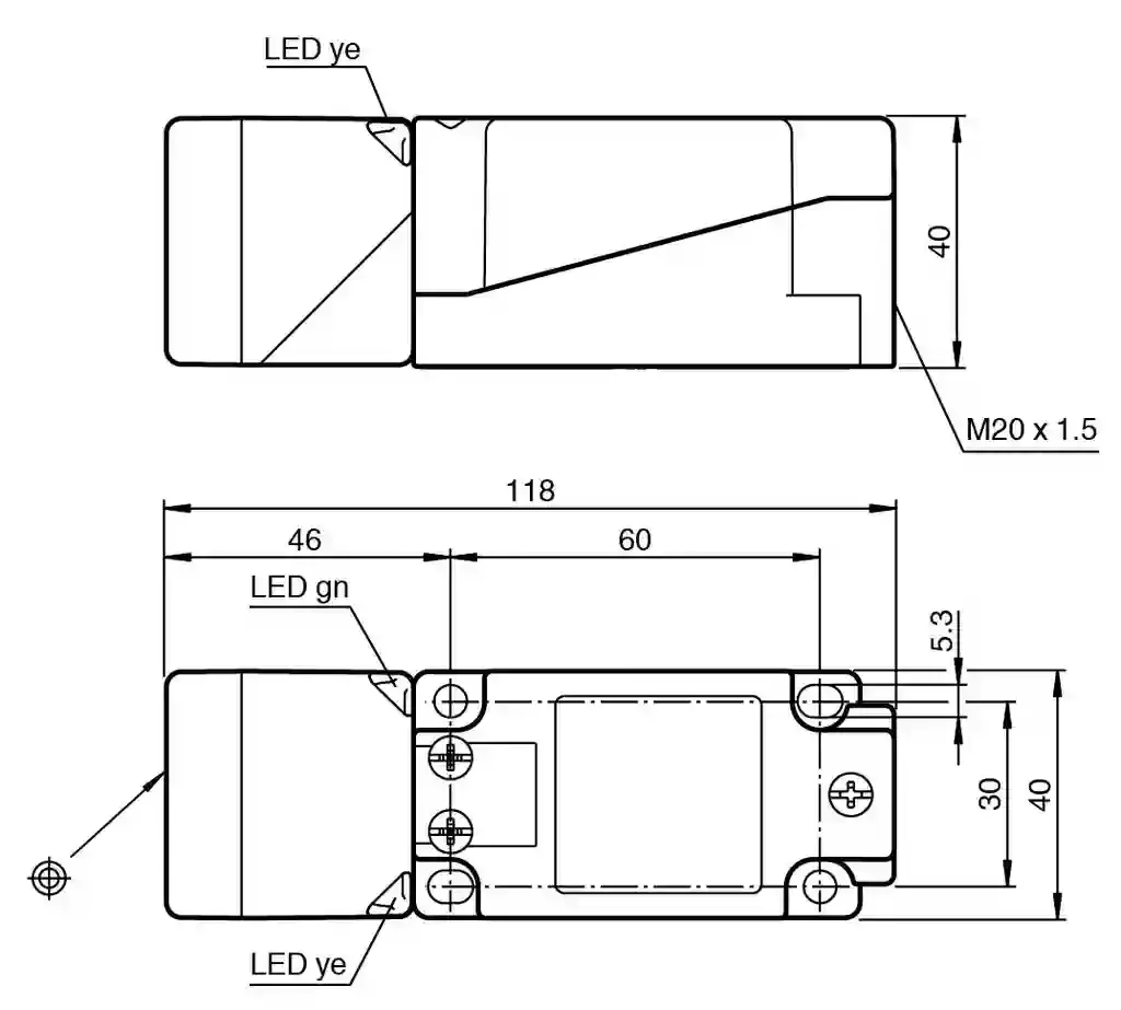 Inductive sensor. Switching function: Normally open/closed (NO/NC), Output type: Two-wire, Installation: flush, Output polarity: AC/DC, Output type: 2-wire, Construction type: Rectangular, Series: VariKont ®, Switching frequency: AC, 0 … 30 HzDC, 0 … 100 Hz, Rated operating voltage: 24 … 250 V DC / 24 … 230 V AC, Operating voltage: 20 … 275 V DC / 20 … 253 V AC, Connection type: terminal compartment, Housing material: PA 6.6 / metal, Degree of protection: IP67. Switching function: Normally open/closed (NO/NC). Output type: Two-wire. Rated operating distance: 20 mm. Installation: flush. Output polarity: AC/DC. Assured operating distance: 0 … 16.2 mm. Actual operating distance: 18 … 22 mm. Reduction factor rAl: 0.4. Reduction factor rCu: 0.3. Reduction factor r304: 0.77. Reduction factor rFe: 1. Reduction factor rBrass: 0.43. Output type: 2-wire. Switching frequency: AC, 0 … 30 HzDC, 0 … 100 Hz. Hysteresis: 1 … 10 % typ. 5 %. Reverse polarity protection: reverse polarity tolerant. Short-circuit protection: pulsing. Voltage drop: ≤ 5 V (typ. 2V) DC operation ≤ 8 V (typ. 3 V) AC operation. Momentary current(20 ms, 0.1 Hz): 0 … 3000 mA. Operating current: 5 … 500 mA. Rated operating current: 500 mA 50/60 Hz. Lowest operating current: 5 mA. Off-state current: ≤ 1.5 mA. Usage category: AC12 , AC140 , DC12 , DC13. Time delay before availability: ≤ 300 ms. Operating voltage indicator: LED, green. Switching state indicator: LED, yellow. Error indicator: flashes when overcurrent. MTTFd: 540 a. Mission Time (TM): 20 a. Diagnostic Coverage (DC): 0 %. Rated operating voltage: 24 … 250 V DC / 24 … 230 V AC. Operating voltage: 20 … 275 V DC / 20 … 253 V AC. Standard conformity: . StandardsEN IEC 60947-5-2: . Standards: EN IEC 60947-5-2. Protection class: II. Rated insulation voltageUi250 VRated impulse withstand voltageUimp2.5 kV: Ui. Rated insulation voltage: 250 V. Rated impulse withstand voltage: 2.5 kV. UL approval: cULus Listed, General Purpose “For use in NFPA 79 Applications only” For overcurrent protection, install a fuse with a rated current of max. 3 A and at least 300 V AC/DC. CCC approval: Ue 75VDC – 250VDC Ue 75VAC – 230VAC. Ambient temperature: -25 … 85 °C (-13 … 185 °F). Storage temperature: -25 … 85 °C (-13 … 185 °F). Pollution degree: 3. Connection type: terminal compartment. Information for connection: A maximum of two conductors with the same core cross section may be mounted on one terminal connection! tightening torque 1.2 Nm + 10 %. Core cross section: up to 2.5 mm2. Minimum core cross-sectionwithout wire end ferrules 0.5 mm2 , with connector sleeves 0.34 mm2Maximum core cross-sectionwithout wire end ferrules 2.5 mm2 , with connector sleeves 1.5 mm2: . Minimum core cross-section: without wire end ferrules 0.5 mm2 , with connector sleeves 0.34 mm2. Maximum core cross-section: without wire end ferrules 2.5 mm2 , with connector sleeves 1.5 mm2. Housing material: PA 6.6 / metal. Sensing face: PA 6.6. Housing base: plastic. Degree of protection: IP67. Mass: 255 g. Dimensions: . Height40 mmWidth40 mmLength118 mm: . Height: 40 mm. Width: 40 mm. Length: 118 mm. Note: Tightening torque: 1.8 Nm (housing)