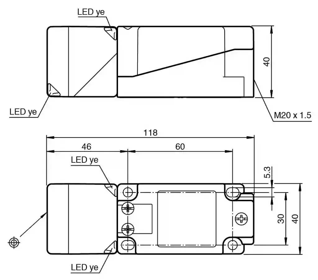 Inductive sensor. Switching function: Normally open/closed (NO/NC), Output type: Two-wire, Installation: flush, Output polarity: DC, Output type: 2-wire, Construction type: VariKont ®, Series: VariKont ®, Operating voltage: 5 … 60 V DC, Type of voltage: DC, Connection type: screw terminals, Housing material: PA/metal with epoxy powder coating, Degree of protection: IP68 / IP69K. Switching function: Normally open/closed (NO/NC). Output type: Two-wire. Rated operating distance: 20 mm. Installation: flush. Output polarity: DC. Assured operating distance: 0 … 16.2 mm. Actual operating distance: 18 … 22 mm typ. 20 mm. Reduction factor rAl: 0.3. Reduction factor rCu: 0.3. Reduction factor r304: 0.7. Output type: 2-wire. Operating voltage: 5 … 60 V DC. Switching frequency: 0 … 250 Hz. Hysteresis: typ. 5 %. Reverse polarity protection: reverse polarity tolerant. Short-circuit protection: yes. Voltage drop: ≤ 5 V. Voltage drop at IL: . Voltage drop IL = 100 mA, switching element onUd… 5 V: Ud. Voltage drop IL = 100 mA, switching element on: … 5 V. Operating current: 2 … 200 mA. Off-state current: 0 … 0.5 mA. Switching state indicator: 2 LED, yellow. MTTFd: 1162 a. Mission Time (TM): 20 a. Diagnostic Coverage (DC): 0 %. Standard conformity: . StandardsEN IEC 60947-5-2: . Standards: EN IEC 60947-5-2. UL approval: cULus Listed Load Type: General Purpose Circuitry: Class 2 Power Source Enclosure Type Rating: Type 1 Supply/Switching Voltage: 60 V DC Output Switching Current: 200 mA. CCC approval: Certified by China Compulsory Certification (CCC). Ambient temperature: -25 … 85 °C (-13 … 185 °F). Connection type: screw terminals. Information for connection: A maximum of two conductors with the same core cross section may be mounted on one terminal connection! tightening torque 1.2 Nm + 10 %. Core cross section: up to 2.5 mm2. Minimum core cross-sectionwithout wire end ferrules 0.5 mm2 , with connector sleeves 0.34 mm2Maximum core cross-sectionwithout wire end ferrules 2.5 mm2 , with connector sleeves 1.5 mm2: . Minimum core cross-section: without wire end ferrules 0.5 mm2 , with connector sleeves 0.34 mm2. Maximum core cross-section: without wire end ferrules 2.5 mm2 , with connector sleeves 1.5 mm2. Housing material: PA/metal with epoxy powder coating. Sensing face: PA. Housing base: plastic. Degree of protection: IP68 / IP69K. Mass: 225 g. Dimensions: . Height40 mmWidth40 mmLength118 mm: . Height: 40 mm. Width: 40 mm. Length: 118 mm. Note: Tightening torque: 1.8 Nm (housing)