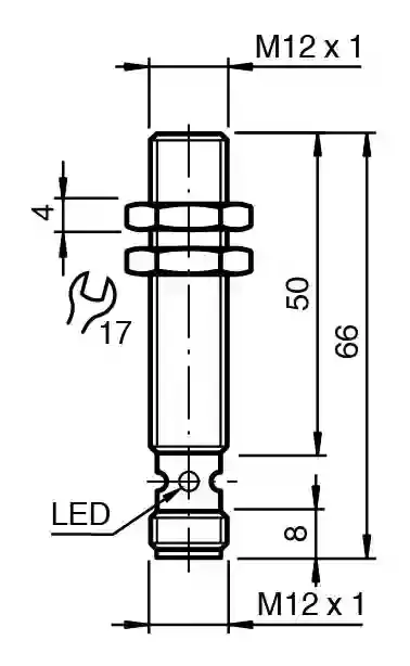 Inductive sensor. Extended temperature range, Switching function: Normally closed (NC), Output type: PNP, Installation: flush, Output polarity: DC, Output type: 3-wire, Thread mold: M12, Construction type: Cylindrical, thread, Series: Cylindrical type, Type of voltage: DC, Ambient temperature: -40 … 85 °C (-40 … 185 °F) , Connection type: Connector plug, Housing material: brass, nickel-plated, Degree of protection: IP68 / IP69K, Threading: M12 x 1. Switching function: Normally closed (NC). Output type: PNP. Rated operating distance: 4 mm. Installation: flush. Output polarity: DC. Assured operating distance: 0 … 3.24 mm. Actuating element: mild steel, e. g. 1.0037, SR235JR (formerly St37-2) 12 mm x 12 mm x 1 mm. Reduction factor rAl: 0.45. Reduction factor rCu: 0.35. Reduction factor r304: 0.75. Reduction factor rBrass: 0.45. Output type: 3-wire. Operating voltage: 5 … 60 V. Switching frequency: 0 … 2500 Hz. Hysteresis: typ. 5%. Reverse polarity protection: reverse polarity protected. Short-circuit protection: pulsing. Inductive overvoltage protection: yes. Surge suppression: yes. Voltage drop: ≤ 2 V. Rated insulation voltage: 60 V. Operating current: 0 … 200 mA. Off-state current: 0 … 0.5 mA typ. 0.1 µA at 25 °C. No-load supply current: ≤ 7 mA. Time delay before availability: ≤ 200 ms. Switching state indicator: Multihole-LED, yellow. MTTFd: 1000.5 a. Mission Time (TM): 20 a. Diagnostic Coverage (DC): 0 %. Standard conformity: . StandardsEN IEC 60947-5-2: . Standards: EN IEC 60947-5-2. UL approval: cULus Listed Load Type: General Purpose Circuitry: Class 2 Power Source Supply/Switching Voltage: 60 V DC Output Switching Current: 200 mA. CSA approval: cCSAus Listed, General Purpose, Class 2 Power Source. CCC approval: Certified by China Compulsory Certification (CCC). E1 Type approval: 10R-06. Ambient temperature: -40 … 85 °C (-40 … 185 °F). Storage temperature: -40 … 85 °C (-40 … 185 °F). Connection type: Connector plug. Housing material: brass, nickel-plated. Sensing face: PBT. Degree of protection: IP68 / IP69K. Connector: . ThreadingM12 x 1Number of pins3: . Threading: M12 x 1. Number of pins: 3. Mass: 20 g. Dimensions: . Length66 mmDiameter12 mm: . Length: 66 mm. Diameter: 12 mm