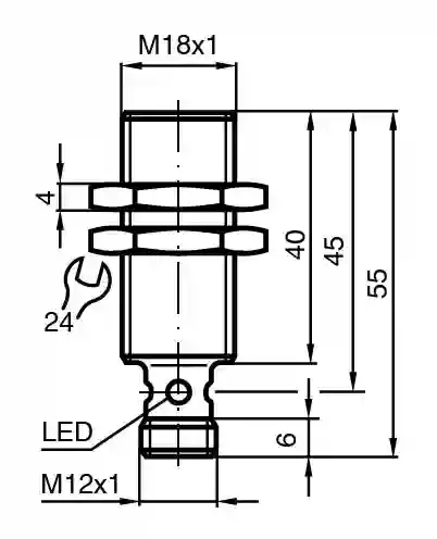 Inductive sensor. Extended temperature range, Switching function: Normally open (NO), Output type: Two-wire, Installation: flush, Output polarity: DC, Output type: 2-wire, Thread mold: M18, Construction type: Cylindrical, thread, Series: Cylindrical type, Type of voltage: DC, Connection type: Connector plug, Housing material: brass, nickel-plated, Degree of protection: IP67, Threading: M12 x 1. Switching function: Normally open (NO). Output type: Two-wire. Rated operating distance: 5 mm. Installation: flush. Output polarity: DC. Assured operating distance: 0 … 4.05 mm ( -25 … 70 °C (-13 … 158 °F) ) 0 … 3.8 mm ( -40 … -25 °C (-40 … -13 °F) ). Actual operating distance: 4.5 … 5.5 mm typ. 5 mm. Reduction factor rAl: 0.34. Reduction factor rCu: 0.31. Reduction factor r304: 0.72. Output type: 2-wire. Operating voltage: 5 … 60 V. Switching frequency: 0 … 500 Hz. Hysteresis: 1 … 10 % typ. 5 %. Reverse polarity protection: reverse polarity tolerant. Short-circuit protection: pulsing. Voltage drop: ≤ 5 V. Operating current: 2 … 100 mA. Lowest operating current: 2 mA. Off-state current: 0 … 0.5 mA typ.. Switching state indicator: Multihole-LED, yellow. MTTFd: 1870 a. Mission Time (TM): 20 a. Diagnostic Coverage (DC): 0 %. Standard conformity: . StandardsEN IEC 60947-5-2: . Standards: EN IEC 60947-5-2. UL approval: cULus Listed Load Type: General Purpose Circuitry: Class 2 Power Source Enclosure Type Rating: Type 1 Supply/Switching Voltage: 60 V DC Output Switching Current: 100 mA. CCC approval: Certified by China Compulsory Certification (CCC). Ambient temperature: -40 … 70 °C (-40 … 158 °F). Connection type: Connector plug. Housing material: brass, nickel-plated. Sensing face: PBT. Degree of protection: IP67. Connector: . ThreadingM12 x 1Number of pins3: . Threading: M12 x 1. Number of pins: 3. Mass: 54 g. Dimensions: . Length40 mmDiameter18 mm: . Length: 40 mm. Diameter: 18 mm