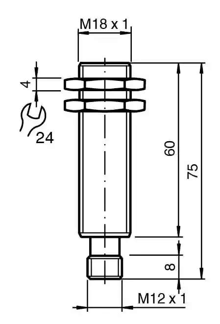 Inductive analog sensor. Output type: Analog current output, Installation: flush, Output polarity: DC, Output type: 3-wire, Thread mold: M18, Construction type: Cylindrical, thread, Series: Cylindrical type, Operating voltage: 10 … 30 V DC typ. 20 V DC, Type of voltage: DC, Connection type: Connector plug, Housing material: brass, nickel-plated, Degree of protection: IP67, Threading: M12 x 1. Output type: Analog current output. Installation: flush. Output polarity: DC. Measuring range: 1 … 5 mm. Output type: 3-wire. Operating voltage: 10 … 30 V DC typ. 20 V DC. Reverse polarity protection: yes. Repeat accuracy: 0 … 80 µm. No-load supply current: ≤ 12 mA. Output type: 0 … 20 mA. Slope of output characteristic: 5 mA / mm. Linearity error: ≤ ± 5 % of full-scale value. Load resistor: ≤ 1000 Ω typ. 500 Ω. Rate of current rise: . 0 … 20 mAmax. 38.9 A/s20 … 0 mAmax. 13.9 A/s: . 0 … 20 mA: max. 38.9 A/s. 20 … 0 mA: max. 13.9 A/s. Recovery time: 1 … 10 ms , typ. 5 ms. Adjustment tolerance zero point: ≤ ± 5 % of full-scale value. Temperature drift: ≤ ± 0.15 %/K of full-scale value. Residual ripple: ± 125 µA. Standard conformity: . StandardsEN IEC 60947-5-2: . Standards: EN IEC 60947-5-2. UL approval: cULus Listed Load Type: General Purpose Circuitry: Class 2 Power Source Enclosure Type Rating: Type 1 Supply/Switching Voltage: 30 V DC. CCC approval: CCC approval / marking not required for products rated ≤36 V. Ambient temperature: -25 … 70 °C (-13 … 158 °F). Connection type: Connector plug. Housing material: brass, nickel-plated. Sensing face: PBT. Degree of protection: IP67. Connector: . ThreadingM12 x 1Number of pins3: . Threading: M12 x 1. Number of pins: 3. Dimensions: . Length75 mmDiameter18 mm: . Length: 75 mm. Diameter: 18 mm