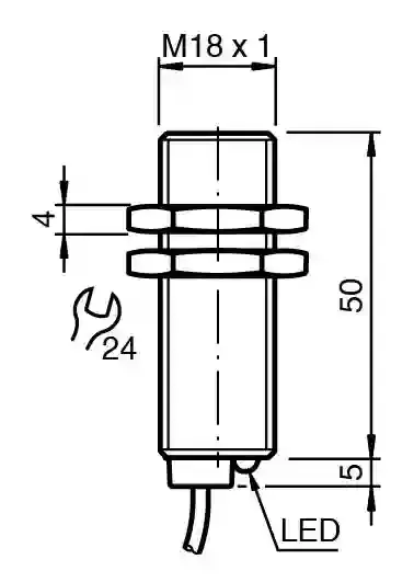 Inductive sensor. Extended temperature range, Switching function: Normally open (NO), Output type: PNP, Installation: flush, Output polarity: DC, Output type: 3-wire, Thread mold: M18, Construction type: Cylindrical, thread, Series: Cylindrical type, Type of voltage: DC, Connection type: cable, Housing material: brass, nickel-plated, Degree of protection: IP68 / IP69K, Material: PUR. Switching function: Normally open (NO). Output type: PNP. Rated operating distance: 8 mm. Installation: flush. Output polarity: DC. Assured operating distance: 0 … 6.48 mm. Reduction factor rAl: 0.4. Reduction factor rCu: 0.3. Reduction factor r304: 0.7. Reduction factor rBrass: 0.45. Output type: 3-wire. Operating voltage: 5 … 60 V. Switching frequency: 0 … 1500 Hz. Hysteresis: typ. 5 %. Reverse polarity protection: reverse polarity protected. Short-circuit protection: pulsing. Inductive overvoltage protection: yes. Surge suppression: yes. Voltage drop: ≤ 2 V. Rated insulation voltage: 60 V. Operating current: 0 … 200 mA. Off-state current: 0 … 0.5 mA typ. 0.1 µA at 25 °C. No-load supply current: ≤ 7 mA. Time delay before availability: ≤ 220 ms. Switching state indicator: LED, yellow. MTTFd: 1085.5 a. Mission Time (TM): 20 a. Diagnostic Coverage (DC): 0 %. Standard conformity: . StandardsEN IEC 60947-5-2: . Standards: EN IEC 60947-5-2. UL approval: cULus Listed Load Type: General Purpose Circuitry: Class 2 Power Source Enclosure Type Rating: Type 1 Supply/Switching Voltage: 60 V DC Output Switching Current: 200 mA. CSA approval: cCSAus Listed, General Purpose, Class 2 Power Source. CCC approval: Certified by China Compulsory Certification (CCC). E1 Type approval: 10R-06. Ambient temperature: -40 … 85 °C (-40 … 185 °F). Storage temperature: -40 … 85 °C (-40 … 185 °F). Connection type: cable. Housing material: brass, nickel-plated. Sensing face: PBT. Degree of protection: IP68 / IP69K. Cable: . Wire end ferrulesyesCable diameter6 mm ± 0.2 mmBending radius> 6 x cable diameterMaterialPURColorblackNumber of cores3Core cross section0.75 mm2LengthL2 m: . Wire end ferrules: yes. Cable diameter: 6 mm ± 0.2 mm. Bending radius: > 6 x cable diameter. Material: PUR. Color: black. Number of cores: 3. Core cross section: 0.75 mm2. Length: 2 m. Mass: 135 g. Dimensions: . Length55 mmDiameter18 mm: . Length: 55 mm. Diameter: 18 mm