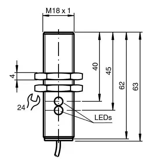 Inductive sensor. Switching function: Normally open (NO), Output type: Two-wire, Installation: flush, Output polarity: AC/DC, Output type: 2-wire, Thread mold: M18, Construction type: Cylindrical, thread, Series: Cylindrical type, Type of voltage: UC, Rated operating voltage: 20 … 250 V AC/DC, Connection type: cable, Housing material: brass, nickel-plated, Degree of protection: IP67, Material: PUR. Switching function: Normally open (NO). Output type: Two-wire. Rated operating distance: 8 mm. Installation: flush. Output polarity: AC/DC. Reduction factor rAl: 0.45. Reduction factor rCu: 0.4. Reduction factor r304: 0.7. Output type: 2-wire. Switching frequency: 30 Hz. Hysteresis: 3 … 15 % typ. 5 %. Reverse polarity protection: reverse polarity tolerant. Short-circuit protection: yes. Voltage drop: ≤ 8 V. Rated operating current: 4 … 300 mA AC/DC. Off-state current: ≤ 0.8 mA. Operating voltage indicator: LED, green. Switching state indicator: LED, yellow. MTTFd: 986 a. Mission Time (TM): 20 a. Diagnostic Coverage (DC): 0 %. Rated operating voltage: 20 … 250 V AC/DC. Standard conformity: . StandardsEN IEC 60947-5-2: . Standards: EN IEC 60947-5-2. UL approval: cULus Listed Load Type: General Purpose Enclosure Type Rating: Type 1. CSA approval: cCSAus Listed, General Purpose. CCC approval: Certified by China Compulsory Certification (CCC). Ambient temperature: -25 … 70 °C (-13 … 158 °F). Storage temperature: -40 … 85 °C (-40 … 185 °F). Connection type: cable. Housing material: brass, nickel-plated. Sensing face: PBT. Degree of protection: IP67. Cable: . Wire end ferrulesyesBending radius> 10 x cable diameterMaterialPURColorblackNumber of cores3Core cross section0.5 mm2LengthL2 m: . Wire end ferrules: yes. Bending radius: > 10 x cable diameter. Material: PUR. Color: black. Number of cores: 3. Core cross section: 0.5 mm2. Length: 2 m. Mass: 176 g. Dimensions: . Length63 mmDiameter18 mm: . Length: 63 mm. Diameter: 18 mm