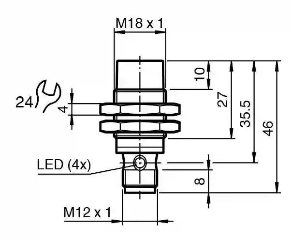 Inductive sensor. Extended temperature range, Switching function: complementary, Output type: NPN, Installation: non-flush, Output polarity: DC, Output type: 4-wire, Thread mold: M18, Construction type: Cylindrical, thread, Series: Cylindrical type, Type of voltage: DC, Connection type: Connector plug, Housing material: brass , white bronze coated, Degree of protection: IP65 / IP66 / IP67 / IP68, Threading: M12 x 1. Switching function: complementary. Output type: NPN. Rated operating distance: 12 mm. Installation: non-flush. Output polarity: DC. Assured operating distance: 0 … 9.72 mm. Actuating element: mild steel, e. g. 1.0037, SR235JR (formerly St37-2) 36 mm x 36 mm x 1 mm. Reduction factor rAl: 0.49. Reduction factor rCu: 0.46. Reduction factor r304: 0.75. Reduction factor rBrass: 0.55. Output type: 4-wire. Operating voltage: 6 … 36 V. Switching frequency: 0 … 1300 Hz. Hysteresis: typ. 5 %. Reverse polarity protection: reverse polarity protected. Short-circuit protection: pulsing. Voltage drop: ≤ 1 V. Operating current: 0 … 200 mA. Off-state current: max. 150 µA. No-load supply current: ≤ 15 mA. Time delay before availability: ≤ 10 ms. Switching state indicator: Multihole-LED, yellow. MTTFd: 1188 a. Mission Time (TM): 20 a. Diagnostic Coverage (DC): 0 %. PWIS conformity: VDMA 24364-A1/B2/C1/T100°C-W. Standard conformity: . StandardsEN IEC 60947-5-2: . Standards: EN IEC 60947-5-2. Protection class: II. Rated insulation voltageUi36 VRated impulse withstand voltageUimp500 V: Ui. Rated insulation voltage: 36 V. Rated impulse withstand voltage: 500 V. UL approval: cULus Listed Load Type: General Purpose Circuitry: Class 2 Power Source Enclosure Type Rating: Type 1 Supply/Switching Voltage: 36 V DC Output Switching Current: 200 mA. CCC approval: CCC approval / marking not required for products rated ≤36 V. Marine approval: DNVGL TAA00003AK. Ambient temperature: -40 … 85 °C (-40 … 185 °F). Storage temperature: -40 … 85 °C (-40 … 185 °F). Connection type: Connector plug. Housing material: brass , white bronze coated. Sensing face: PBT , green. Degree of protection: IP65 / IP66 / IP67 / IP68. Connector: . ThreadingM12 x 1Number of pins4: . Threading: M12 x 1. Number of pins: 4. Mass: 44 g. Dimensions: . Length46 mmDiameter18 mm: . Length: 46 mm. Diameter: 18 mm. Mounting: with nuts, M18. Tightening torque: ≤ 30 Nm. Scope of delivery: 2 self locking nuts in scope of delivery
