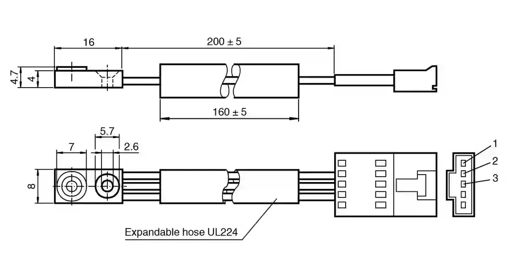 Inductive sensor. Switching function: Normally open (NO), Output type: PNP, Installation: non-flush, Output polarity: DC, Output type: 3-wire, Construction type: Rectangular, Series: Rectangular type, Operating voltage: 5 V -5% +10%, Type of voltage: DC, Connection type: flexible leads PVC , 200 mm , twisted, Housing material: PA, Degree of protection: IP67. Switching function: Normally open (NO). Output type: PNP. Rated operating distance: 2 mm. Installation: non-flush. Output polarity: DC. Assured operating distance: 0 … 1.8 mm. Reduction factor rAl: 0.3. Reduction factor rCu: 0.2. Reduction factor r304: 0.7. Output type: 3-wire. Operating voltage: 5 V -5% +10%. Switching frequency: 0 … 800 Hz. Hysteresis: typ. 5 %. Reverse polarity protection: no. Short-circuit protection: pulsing. Voltage drop: ≤ 1.5 V. Operating current: 0 … 100 mA. Off-state current: ≤ 10 µA. No-load supply current: ≤ 15 mA. Time delay before availability: ≤ 20 ms. MTTFd: 4830 a. Mission Time (TM): 20 a. Diagnostic Coverage (DC): 0 %. Standard conformity: . StandardsEN IEC 60947-5-2: . Standards: EN IEC 60947-5-2. UL approval: cULus Listed Load Type: General Purpose Circuitry: Class 2 Power Source Enclosure Type Rating: Type 1 Supply/Switching Voltage: 5 V DC Output Switching Current: 100 mA. Ambient temperature: 15 … 35 °C (59 … 95 °F). Connection type: flexible leads PVC , 200 mm , twisted. Connection assembly: AMP socket housing 103653-04 AMP crimp 5-104506-6. Core cross section: 0.08 mm2. Housing material: PA. Sensing face: PA. Degree of protection: IP67. Dimensions: . Height4.7 mmWidth8 mmLength16 mm: . Height: 4.7 mm. Width: 8 mm. Length: 16 mm
