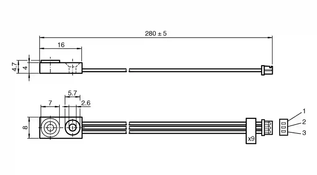 Inductive sensor. Switching function: Normally open (NO), Output type: PNP, Installation: non-flush, Output polarity: DC, Output type: 3-wire, Construction type: Rectangular, Series: Rectangular type, Operating voltage: 5 V -5% +10%, Type of voltage: DC, Connection type: flexible leads PVC , 280 mm , twisted, Housing material: PA, Degree of protection: IP67. Switching function: Normally open (NO). Output type: PNP. Rated operating distance: 2 mm. Installation: non-flush. Output polarity: DC. Assured operating distance: 0 … 1.8 mm. Reduction factor rAl: 0.3. Reduction factor rCu: 0.2. Reduction factor r304: 0.7. Output type: 3-wire. Operating voltage: 5 V -5% +10%. Switching frequency: 0 … 800 Hz. Hysteresis: typ. 5 %. Reverse polarity protection: no. Short-circuit protection: pulsing. Voltage drop: ≤ 1.5 V. Operating current: 0 … 100 mA. Off-state current: ≤ 10 µA. No-load supply current: ≤ 15 mA. Time delay before availability: ≤ 20 ms. MTTFd: 4830 a. Mission Time (TM): 20 a. Diagnostic Coverage (DC): 0 %. Standard conformity: . StandardsEN IEC 60947-5-2: . Standards: EN IEC 60947-5-2. UL approval: cULus Listed Load Type: General Purpose Circuitry: Class 2 Power Source Enclosure Type Rating: Type 1 Supply/Switching Voltage: 5 V DC Output Switching Current: 100 mA. Ambient temperature: 15 … 35 °C (59 … 95 °F). Connection type: flexible leads PVC , 280 mm , twisted. Connection assembly: Molex socket housing 51021-0300 Molex crimp 50058-8000. Core cross section: 0.08 mm2. Housing material: PA. Sensing face: PA. Degree of protection: IP67. Dimensions: . Height4.7 mmWidth8 mmLength16 mm: . Height: 4.7 mm. Width: 8 mm. Length: 16 mm