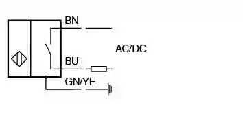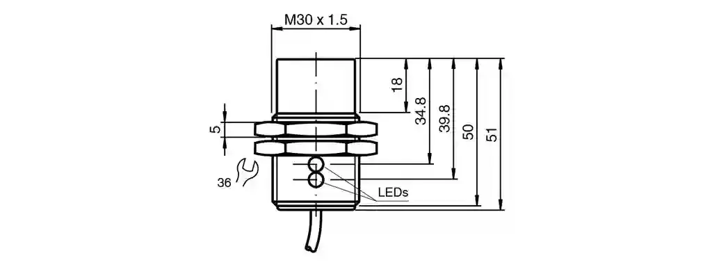 Inductive sensor. Switching function: Normally open (NO), Output type: Two-wire, Installation: non-flush, Output polarity: AC/DC, Output type: 3-wire, Thread mold: M30, Construction type: Cylindrical, thread, Series: Cylindrical type, Type of voltage: UC, Rated operating voltage: 20 … 250 V AC/DC, Connection type: cable, Housing material: brass, nickel-plated, Degree of protection: IP67, Material: PUR. Switching function: Normally open (NO). Output type: Two-wire. Rated operating distance: 25 mm. Installation: non-flush. Output polarity: AC/DC. Reduction factor rAl: 0.47. Reduction factor rCu: 0.44. Reduction factor r304: 0.77. Output type: 3-wire. Switching frequency: 30 Hz. Hysteresis: 3 … 15 % typ. 5 %. Reverse polarity protection: reverse polarity tolerant. Short-circuit protection: yes. Voltage drop: ≤ 8 V. Rated operating current: 4 … 500 mA AC/DC. Off-state current: ≤ 0.8 mA. Operating voltage indicator: LED, green. Switching state indicator: LED, yellow. Rated operating voltage: 20 … 250 V AC/DC. Standard conformity: . StandardsEN IEC 60947-5-2: . Standards: EN IEC 60947-5-2. UL approval: cULus Listed Load Type: General Purpose Enclosure Type Rating: Type 1. CSA approval: cCSAus Listed, General Purpose. CCC approval: Certified by China Compulsory Certification (CCC). Ambient temperature: -25 … 70 °C (-13 … 158 °F). Storage temperature: -40 … 85 °C (-40 … 185 °F). Connection type: cable. Housing material: brass, nickel-plated. Sensing face: PBT. Degree of protection: IP67. Cable: . Wire end ferrulesyesCable diameter6.2 mm ± 0.6 mmBending radius> 10 x cable diameterMaterialPURColorblackNumber of cores3Core cross section0.5 mm2LengthL2 m: . Wire end ferrules: yes. Cable diameter: 6.2 mm ± 0.6 mm. Bending radius: > 10 x cable diameter. Material: PUR. Color: black. Number of cores: 3. Core cross section: 0.5 mm2. Length: 2 m. Mass: 220 g. Dimensions: . Length51 mmDiameter30 mm: . Length: 51 mm. Diameter: 30 mm