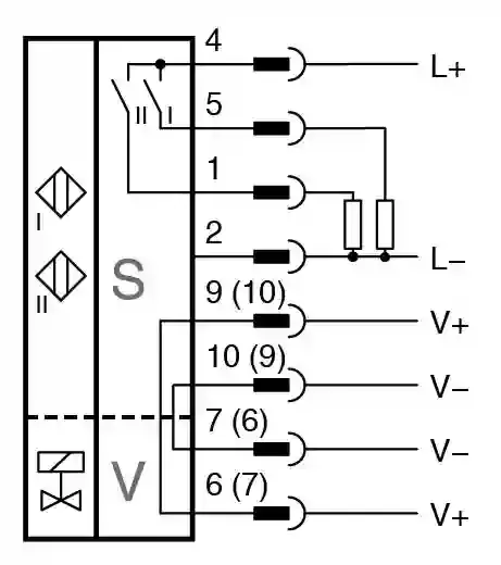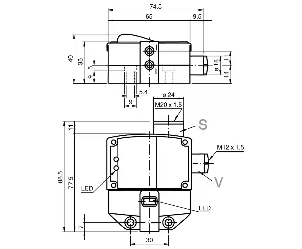 Inductive sensor. Valve position detection, Solenoid valve output, Switching function: 2 x normally open (NO), Output type: PNP, Installation: flush mountable, Output polarity: DC, Output type: 4-wire, Construction type: Dual sensor, Series: Dual sensor, Operating voltage: 10 … 30 V DC, Type of voltage: DC, Connection (system side): Cage tension spring terminals, Housing material: PBT, Degree of protection: IP67. Switching function: 2 x normally open (NO). Output type: PNP. Rated operating distance: 3 mm. Installation: flush mountable. Output polarity: DC. Assured operating distance: 0 … 2.43 mm. Actual operating distance: 2.7 … 3.3 mm typ.. Reduction factor rAl: 0.5. Reduction factor rCu: 0.4. Reduction factor r304: 1. Reduction factor rSt37: 1.2. Output type: 4-wire. Operating voltage: 10 … 30 V DC. Switching frequency: 0 … 500 Hz. Hysteresis: typ. 5 %. Reverse polarity protection: all connections. Short-circuit protection: pulsing. Voltage drop: ≤ 3 V. Operating current: 0 … 100 mA. Off-state current: 0 … 0.5 mA typ. 0.1 µA. No-load supply current: ≤ 25 mA. Operating voltage indicator: LED, green. Switching state indicator: LED, yellow. Valve status indicator: LED, yellow. MTTFd: 780 a. Mission Time (TM): 20 a. Diagnostic Coverage (DC): 0 %. Voltage: max. 32 V DC. Current: max. 240 mA. Short-circuit protection: no. Reverse polarity protection: yes, with reversed output LED is out of function, therfore more power for solenoid valve. Standard conformity: . StandardsEN IEC 60947-5-2: . Standards: EN IEC 60947-5-2. UL approval: cULus Listed Load Type: General Purpose Circuitry: Class 2 Power Source Enclosure Type Rating: Type 1 Supply/Switching Voltage: 30 V DC Output Switching Current: 100 mA. CCC approval: CCC approval / marking not required for products rated ≤36 V. Ambient temperature: -25 … 70 °C (-13 … 158 °F). Connection (system side): Cage tension spring terminals. Core cross section (system side): 1.5/2.5 mm2 flexible/rigid. Connection (valve side): Cage tension spring terminals. Core cross section (valve side): 1.5/2.5 mm2 flexible/rigid. Housing material: PBT. Sensing face: PBT. Degree of protection: IP67. Tightening torque, fastening screws: ≤ 5 Nm. Tightening torque, housing screws: 1 Nm. Tightening torque, cable gland: M20 x 1.5 ; max. 7 Nm M12 x 1.5 ; max. 1.5 Nm. Dimensions: . Height35.5 mmWidth65 mmLength77.5 mm: . Height: 35.5 mm. Width: 65 mm. Length: 77.5 mm
