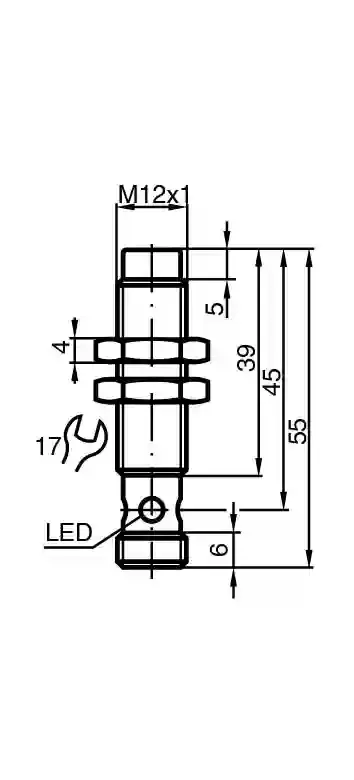Inductive sensor. Switching function: Normally open (NO), Output type: Two-wire, Installation: non-flush, Output polarity: DC, Output type: 2-wire, Thread mold: M12, Construction type: Cylindrical, thread, Series: Cylindrical type, Type of voltage: DC, Connection type: Connector plug, Housing material: Stainless steel 1.4305 / AISI 303, Degree of protection: IP67, Threading: M12 x 1. Switching function: Normally open (NO). Output type: Two-wire. Rated operating distance: 4 mm. Installation: non-flush. Output polarity: DC. Assured operating distance: 0 … 3.24 mm. Actual operating distance: 3.6 … 4.4 mm typ.. Reduction factor rAl: 0.42. Reduction factor rCu: 0.4. Reduction factor r304: 0.75. Output type: 2-wire. Operating voltage: 5 … 60 V. Switching frequency: 0 … 800 Hz. Hysteresis: 1 … 10 % typ. 5 %. Reverse polarity protection: reverse polarity tolerant. Short-circuit protection: pulsing. Voltage drop: ≤ 5 V. Voltage drop at IL: . Voltage drop IL = 10 mA, switching element onUd3.5 … 4.7 V typ. 4.3 V: Ud. Voltage drop IL = 10 mA, switching element on: 3.5 … 4.7 V typ. 4.3 V. Operating current: 2 … 100 mA. Off-state current: 0 … 0.5 mA typ.. Time delay before availability: ≤ 15 ms. Switching state indicator: Multihole-LED, yellow. MTTFd: 2020 a. Mission Time (TM): 20 a. Diagnostic Coverage (DC): 0 %. Standard conformity: . StandardsEN IEC 60947-5-2: . Standards: EN IEC 60947-5-2. UL approval: cULus Listed Load Type: General Purpose Circuitry: Class 2 Power Source Enclosure Type Rating: Type 1 Supply/Switching Voltage: 60 V DC Output Switching Current: 100 mA. CCC approval: Certified by China Compulsory Certification (CCC). Ambient temperature: -25 … 70 °C (-13 … 158 °F). Connection type: Connector plug. Housing material: Stainless steel 1.4305 / AISI 303. Sensing face: PBT. Degree of protection: IP67. Connector: . ThreadingM12 x 1Number of pins3: . Threading: M12 x 1. Number of pins: 3. Mass: 26 g. Dimensions: . Length40 mmDiameter12 mm: . Length: 40 mm. Diameter: 12 mm