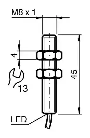 Inductive sensor. Switching function: Normally open (NO), Output type: PNP, Installation: quasi flush, Output polarity: DC, Output type: 3-wire, Thread mold: M8, Construction type: Cylindrical, thread, Series: Cylindrical type, Type of voltage: DC, Connection type: cable, Housing material: chromium plated brass, Degree of protection: IP67, Material: PUR. Switching function: Normally open (NO). Output type: PNP. Rated operating distance: 4 mm. Installation: quasi flush. Output polarity: DC. Assured operating distance: 0 … 3.24 mm. Reduction factor rAl: 0.25. Reduction factor rCu: 0.22. Reduction factor r304: 0.65. Output type: 3-wire. Operating voltage: 10 … 30 V. Switching frequency: 0 … 500 Hz. Reverse polarity protection: reverse polarity protected. Short-circuit protection: pulsing. Voltage drop: ≤ 2 V. Operating current: 0 … 200 mA. Off-state current: 0 … 0.1 mA typ. 0.1 µA at 25 °C. No-load supply current: ≤ 10 mA. Switching state indicator: LED, yellow. MTTFd: 311 a. Mission Time (TM): 20 a. Diagnostic Coverage (DC): 0 %. Standard conformity: . StandardsEN IEC 60947-5-2: . Standards: EN IEC 60947-5-2. UL approval: cULus Listed, General Purpose. CSA approval: cCSAus Listed, General Purpose. CCC approval: CCC approval / marking not required for products rated ≤36 V. Ambient temperature: -25 … 70 °C (-13 … 158 °F). Connection type: cable. Housing material: chromium plated brass. Sensing face: PBT. Degree of protection: IP67. Cable: . MaterialPURCore cross section0.14 mm2LengthL2 m: . Material: PUR. Core cross section: 0.14 mm2. Length: 2 m. Dimensions: . Length45 mmDiameter8 mm: . Length: 45 mm. Diameter: 8 mm