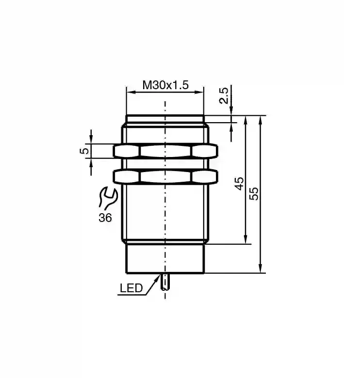 Inductive sensor. Metal face proximity sensors, metal face, Switching function: Normally open (NO), Output type: PNP, Installation: flush (Requirements: see drawing below), Output polarity: DC, Output type: 3-wire, Thread mold: M30, Construction type: Cylindrical, thread, Series: Cylindrical type, Operating voltage: 10 … 30 V DC, Type of voltage: DC, Connection type: cable, Housing material: Stainless steel 1.4305 / AISI 303, Degree of protection: IP69K, Material: PUR. Switching function: Normally open (NO). Output type: PNP. Rated operating distance: 15 mm. Installation: flush (Requirements: see drawing below). Output polarity: DC. Assured operating distance: 0 … 12.15 mm. Actuating element: Ferrous and nonferrous targets. Reduction factor rAl: 0.4. Reduction factor rCu: 0.2. Reduction factor r304: 0.85. Reduction factor rSt37: 1. Output type: 3-wire. Operating voltage: 10 … 30 V DC. Switching frequency: 0 … 150 Hz. Hysteresis: 3 … 15 typ. 10 %. Reverse polarity protection: reverse polarity protected. Short-circuit protection: pulsing. Voltage drop: ≤ 2 V. Operating current: ≤ 200 mA. Off-state current: ≤ 10 µA. No-load supply current: ≤ 10 mA. Operating voltage indicator: LED, green. Switching state indicator: LED, yellow. MTTFd: 893 a. Mission Time (TM): 20 a. Diagnostic Coverage (DC): 0 %. Standard conformity: . StandardsEN IEC 60947-5-2: . Standards: EN IEC 60947-5-2. UL approval: cULus Listed Load Type: General Purpose Circuitry: Class 2 Power Source Enclosure Type Rating: Type 1 Supply/Switching Voltage: 30 V DC Output Switching Current: 200 mA. CCC approval: CCC approval / marking not required for products rated ≤36 V. Ambient temperature: -25 … 70 °C (-13 … 158 °F). Connection type: cable. Housing material: Stainless steel 1.4305 / AISI 303. Sensing face: Stainless steel 1.4305 / AISI 303. Degree of protection: IP69K. Cable: . Wire end ferrulesyesCable diameter6.2 mm ± 0.2 mmBending radius> 10 x cable diameterMaterialPURColorblackNumber of cores3Core cross section0.5 mm2LengthL2 m: . Wire end ferrules: yes. Cable diameter: 6.2 mm ± 0.2 mm. Bending radius: > 10 x cable diameter. Material: PUR. Color: black. Number of cores: 3. Core cross section: 0.5 mm2. Length: 2 m. Dimensions: . Length55 mmDiameter30 mm: . Length: 55 mm. Diameter: 30 mm