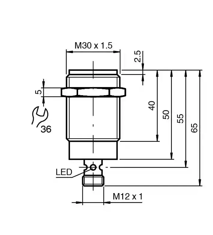 Inductive sensor. Metal face proximity sensors, metal face, Switching function: Normally open (NO), Output type: NPN, Installation: flush (Requirements: see drawing below), Output polarity: DC, Output type: 3-wire, Thread mold: M30, Construction type: Cylindrical, thread, Series: Cylindrical type, Operating voltage: 10 … 30 V DC, Type of voltage: DC, Connection type: Connector plug, Housing material: Stainless steel 1.4305 / AISI 303. Switching function: Normally open (NO). Output type: NPN. Rated operating distance: 15 mm. Installation: flush (Requirements: see drawing below). Output polarity: DC. Assured operating distance: 0 … 12.15 mm. Actuating element: Ferrous and nonferrous targets. Reduction factor rAl: 0.4. Reduction factor rCu: 0.2. Reduction factor r304: 0.85. Reduction factor rSt37: 1. Output type: 3-wire. Operating voltage: 10 … 30 V DC. Switching frequency: 0 … 150 Hz. Hysteresis: 3 … 15 typ. 10 %. Reverse polarity protection: reverse polarity protected. Short-circuit protection: pulsing. Voltage drop: ≤ 2 V. Operating current: ≤ 200 mA. Off-state current: ≤ 10 µA. No-load supply current: ≤ 15 mA. Operating voltage indicator: LED, green. Switching state indicator: LED, yellow. MTTFd: 847 a. Mission Time (TM): 20 a. Diagnostic Coverage (DC): 0 %. Standard conformity: . StandardsEN IEC 60947-5-2: . Standards: EN IEC 60947-5-2. UL approval: cULus Listed Load Type: General Purpose Circuitry: Class 2 Power Source Enclosure Type Rating: Type 1 Supply/Switching Voltage: 30 V DC Output Switching Current: 200 mA. CCC approval: CCC approval / marking not required for products rated ≤36 V. Ambient temperature: -25 … 70 °C (-13 … 158 °F). Connection type: Connector plug. Housing material: Stainless steel 1.4305 / AISI 303. Sensing face: Stainless steel 1.4305 / AISI 303. Degree of protection: IP67 / IP68 / IP69K – cordset dependent according to cable specification. Connector: . ThreadingM12 x 1Number of pins4: . Threading: M12 x 1. Number of pins: 4. Dimensions: . Length65 mmDiameter30 mm: . Length: 65 mm. Diameter: 30 mm