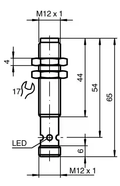 Inductive sensor. Metal face proximity sensors, metal face, Switching function: Normally open (NO), Output type: PNP, Installation: flush, Output polarity: DC, Output type: 3-wire, Thread mold: M12, Construction type: Cylindrical, thread, Series: Cylindrical type, Operating voltage: 10 … 30 V DC, Type of voltage: DC, Connection type: Connector plug, Housing material: Stainless steel 1.4305 / AISI 303, Degree of protection: IP67 / IP68 / IP69K – cordset dependent according to cable specification, Threading: M12 x 1. Switching function: Normally open (NO). Output type: PNP. Rated operating distance: 2 mm. Installation: flush. Output polarity: DC. Assured operating distance: 0 … 1.62 mm. Actuating element: Ferrous targets. Reduction factor rAl: 0. Reduction factor rCu: 0. Reduction factor r304: 0.25. Reduction factor r316Ti: 0.1. Reduction factor rSt37: 1. Reduction factor rBrass: 0. Output type: 3-wire. Operating voltage: 10 … 30 V DC. Switching frequency: 100 Hz. Hysteresis: 3 … 15 typ. 5 %. Reverse polarity protection: reverse polarity protected. Short-circuit protection: pulsing. Voltage drop: ≤ 2 V DC. Operating current: ≤ 200 mA For a temperature range above 50°C, the permissible operating current IL ≤ 150 mA. Current consumption: < 14 mA. Off-state current: ≤ 10 µA. MTTFd: 990 a. Mission Time (TM): 20 a. Diagnostic Coverage (DC): 0 %. Operation indicator: 4-way dual LEDGreen: powerYellow: output. Standard conformity: . StandardsEN IEC 60947-5-2: . Standards: EN IEC 60947-5-2. UL approval: cULus Listed Load Type: General Purpose Circuitry: Class 2 Power Source Enclosure Type Rating: Type 1 Supply/Switching Voltage: 30 V DC Output Switching Current: 200 mA. CCC approval: CCC approval / marking not required for products rated ≤36 V. Ambient temperature: -40 … 70 °C (-40 … 158 °F). Connection type: Connector plug. Housing material: Stainless steel 1.4305 / AISI 303. Sensing face: Stainless steel 1.4305 / AISI 303. Degree of protection: IP67 / IP68 / IP69K – cordset dependent according to cable specification. Connector: . ThreadingM12 x 1Number of pins4: . Threading: M12 x 1. Number of pins: 4. Dimensions: . Length65 mmDiameter12 mm: . Length: 65 mm. Diameter: 12 mm