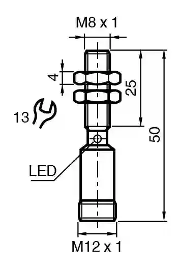 Inductive sensor. Metal face proximity sensors, metal face, Switching function: Normally open (NO), Output type: NPN, Installation: flush, Output polarity: DC, Output type: 3-wire, Thread mold: M8, Construction type: Cylindrical, thread, Series: Cylindrical type, Operating voltage: 10 … 30 V DC, Type of voltage: DC, Connection type: Connector plug, Housing material: Stainless steel 1.4305 / AISI 303, Degree of protection: IP67, Threading: M12 x 1. Switching function: Normally open (NO). Output type: NPN. Rated operating distance: 3 mm. Installation: flush. Output polarity: DC. Assured operating distance: 0 … 2.43 mm. Reduction factor rAl: 0.3. Reduction factor rCu: 0.2. Reduction factor r304: 0.7. Output type: 3-wire. Operating voltage: 10 … 30 V DC. Switching frequency: 0 … 360 Hz. Hysteresis: 5 … 15 typ. 10 %. Reverse polarity protection: reverse polarity protected. Short-circuit protection: pulsing. Voltage drop: ≤ 2 V. Operating current: 0 … 100 mA. Off-state current: 0 … 10 µA typ. 0.1 µA at 25 °C. No-load supply current: ≤ 10 mA. Switching state indicator: LED, red. Standards: EN 60947-5-2:2007 IEC 60947-5-2:2007. UL approval: cULus Listed Load Type: General Purpose Circuitry: Class 2 Power Source Enclosure Type Rating: Type 1 Supply/Switching Voltage: 30 V DC Output Switching Current: 100 mA. CCC approval: CCC approval / marking not required for products rated ≤36 V. Ambient temperature: -25 … 75 °C (-13 … 167 °F). Connection type: Connector plug. Housing material: Stainless steel 1.4305 / AISI 303. Sensing face: Stainless steel 1.4305 / AISI 303. Degree of protection: IP67. Connector: . ThreadingM12 x 1Number of pins4: . Threading: M12 x 1. Number of pins: 4. Dimensions: . Length50 mmDiameter8 mm: . Length: 50 mm. Diameter: 8 mm
