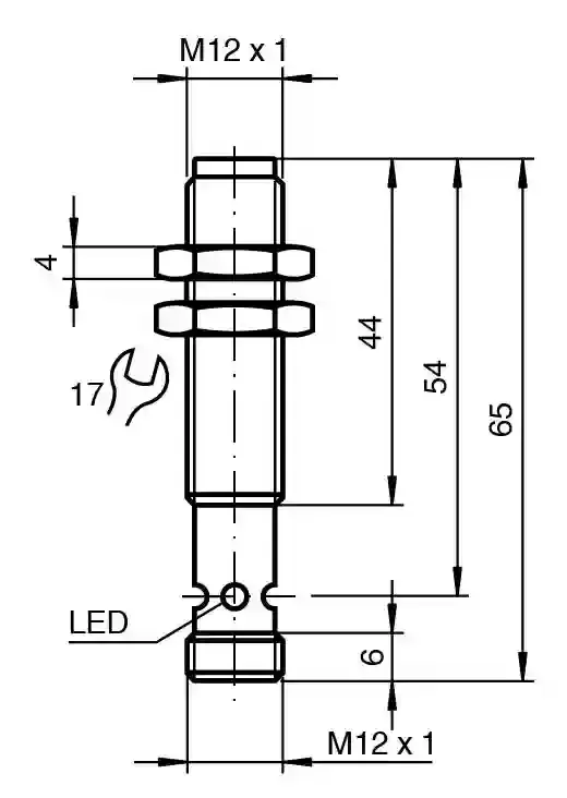 Inductive sensor. Metal face proximity sensors, metal face, Switching function: Normally open (NO), Output type: PNP, Installation: flush (Requirements: see drawing below), Output polarity: DC, Output type: 3-wire, Thread mold: M12, Construction type: Cylindrical, thread, Series: Cylindrical type, Operating voltage: 10 … 30 V DC, Type of voltage: DC, Connection type: Connector plug, Housing material: Stainless steel 1.4305 / AISI 303. Switching function: Normally open (NO). Output type: PNP. Rated operating distance: 5 mm. Installation: flush (Requirements: see drawing below). Output polarity: DC. Assured operating distance: 0 … 4.05 mm. Actuating element: Ferrous and nonferrous targets. Reduction factor rAl: 0.3. Reduction factor rCu: 0.2. Reduction factor r304: 0.85. Reduction factor rSt37: 1. Output type: 3-wire. Operating voltage: 10 … 30 V DC. Switching frequency: 0 … 360 Hz. Hysteresis: 3 … 15 typ. 5 %. Reverse polarity protection: reverse polarity protected. Short-circuit protection: pulsing. Voltage drop: ≤ 2 V DC. Operating current: ≤ 200 mA For a temperature range above 50°C, the permissible operating current IL ≤ 150 mA. Off-state current: ≤ 10 µA. No-load supply current: ≤ 15 mA. Operating voltage indicator: LED, green. Switching state indicator: LED, yellow. MTTFd: 880 a. Mission Time (TM): 20 a. Diagnostic Coverage (DC): 0 %. Standard conformity: . StandardsEN IEC 60947-5-2: . Standards: EN IEC 60947-5-2. UL approval: cULus Listed Load Type: General Purpose Circuitry: Class 2 Power Source Enclosure Type Rating: Type 1 Supply/Switching Voltage: 30 V DC Output Switching Current: 200 mA. CCC approval: CCC approval / marking not required for products rated ≤36 V. Ambient temperature: -25 … 70 °C (-13 … 158 °F). Connection type: Connector plug. Housing material: Stainless steel 1.4305 / AISI 303. Sensing face: Stainless steel 1.4305 / AISI 303. Degree of protection: IP67 / IP68 / IP69K – cordset dependent according to cable specification. Connector: . ThreadingM12 x 1Number of pins4: . Threading: M12 x 1. Number of pins: 4. Dimensions: . Length65 mmDiameter12 mm: . Length: 65 mm. Diameter: 12 mm