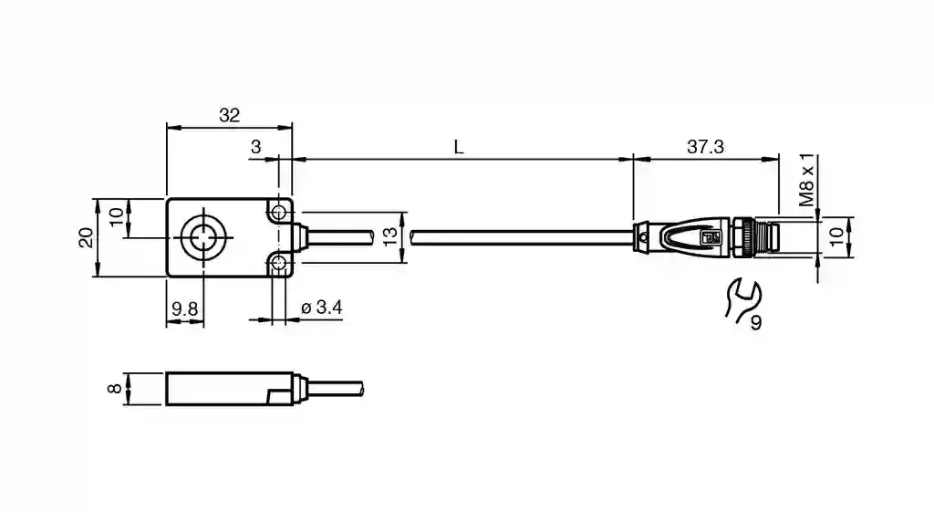 Inductive sensor. Metal face proximity sensors, metal face, Switching function: Normally open (NO), Output type: NPN, Installation: flush, Output type: 3-wire, Series: Rectangular type, Operating voltage: 10 … 30 V DC, Type of voltage: DC, Connection type: fixed cable with plug, Housing material: Stainless steel 1.4305 / AISI 303 , Degree of protection: IP67, Threading: M8 x 1, Material: PUR. Switching function: Normally open (NO). Output type: NPN. Rated operating distance: 6 mm. Installation: flush. Assured operating distance: 0 … 4.86 mm. Actuating element: Ferrous targets. Reduction factor rAl: 0. Reduction factor rCu: 0. Reduction factor r304: 0.6 … 0.8. Reduction factor rSt37: 1. Output type: 3-wire. Operating voltage: 10 … 30 V DC. Switching frequency: 20 Hz. Hysteresis: 5 … 15 typ. 10 %. Reverse polarity protection: reverse polarity protected. Short-circuit protection: yes. Voltage drop: ≤ 2 V. Operating current: ≤ 100 mA. Current consumption: ≤ 22 mA. Off-state current: ≤ 10 µA. Operation indicator: Dual LEDGreen: powerYellow: output. Standards: EN 60947-5-2:2007 IEC 60947-5-2:2007. UL approval: cULus Listed Load Type: General Purpose Circuitry: Class 2 Power Source Enclosure Type Rating: Type 1 Supply/Switching Voltage: 30 V DC Output Switching Current: 100 mA. CCC approval: CCC approval / marking not required for products rated ≤36 V. Ambient temperature: -25 … 70 °C (-13 … 158 °F). Connection type: fixed cable with plug. Housing material: Stainless steel 1.4305 / AISI 303. Degree of protection: IP67. Connector: . ThreadingM8 x 1Tightening torque≤ 0.4 NmNumber of pins3: . Threading: M8 x 1. Tightening torque: ≤ 0.4 Nm. Number of pins: 3. Cable: . Cable diameter4.3 mm ± 0.1 mmBending radius> 10 x cable diameterMaterialPURColorblackNumber of cores3Core cross section0.34 mm2LengthL200 mm: . Cable diameter: 4.3 mm ± 0.1 mm. Bending radius: > 10 x cable diameter. Material: PUR. Color: black. Number of cores: 3. Core cross section: 0.34 mm2. Length: 200 mm. Dimensions: . Height8 mmWidth20 mmLength32 mm: . Height: 8 mm. Width: 20 mm. Length: 32 mm