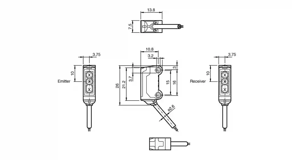 Thru-beam sensor (pair). Laser thru-beam sensor, ultra-small design with M3 mounting, 10 m detection range, dark on, NPN output, 2 m fixed cable, Ultra-small housing design, DuraBeam Laser Sensors – durable and employable like an LED, 45° cable outlet for maximum mounting freedom under extremely tight space constraints. Emitter: OBE10M-R3-S-P-L. Receiver: OBE10M-R3-E0-P-L. Effective detection range: 0 … 10 m. Threshold detection range: 15 m. Light source: laser diode. Light type: modulated visible red light , 680 nm. Laser nominal ratings: . NoteLASER LIGHT , DO NOT STARE INTO BEAMLaser class1Wave length680 nmBeam divergence> 5 mradPulse lengthapprox. 3 µsRepetition rateapprox. 16.6 kHzmax. pulse energy9.5 nJ: . Note: LASER LIGHT , DO NOT STARE INTO BEAM. Laser class: 1. Wave length: 680 nm. Beam divergence: > 5 mrad. Pulse length: approx. 3 µs. Repetition rate: approx. 16.6 kHz. max. pulse energy: 9.5 nJ. Diameter of the light spot: approx. 20 mm at a distance of 10 m. Opening angle: approx. 0.5 °. Optical face: frontal. Ambient light limit: EN 60947-5-2 : 30000 Lux. MTTFd: 806 a. Mission Time (TM): 20 a. Diagnostic Coverage (DC): 0 %. Operation indicator: LED green, statically lit Power on , short-circuit : LED green flashing (approx. 4 Hz). Function indicator: Receiver: LED yellow, lights up when light beam is free, flashes when falling short of the operating reserve ; OFF when light beam is interrupted. Operating voltage: 12 … 24 V. No-load supply current: Emitter: ≤ 10 mA Receiver: ≤ 8 mA. Protection class: III. Test input: Test of switching function at 0 V. Switching threshold: Teach-In input. Switching type: NO contact / dark on. Signal output: 1 NPN output, short-circuit protected, reverse polarity protected, open collector. Switching voltage: max. 30 V DC. Switching current: max. 50 mA , resistive load. Voltage drop: ≤ 1.5 V DC. Switching frequency: approx. 2 kHz. Response time: 250 µs. Product standard: EN 60947-5-2. Laser safety: EN 60825-1:2007. UL approval: E87056 , cULus Recognized, Class 2 Power Source. CCC approval: CCC approval / marking not required for products rated ≤36 V. FDA approval: IEC 60825-1:2007 Complies with 21 CFR 1040.10 and 1040.11 except for deviations pursuant to Laser Notice No. 50, dated June 24, 2007. Ambient temperature: -20 … 60 °C (-4 … 140 °F). Storage temperature: -30 … 70 °C (-22 … 158 °F). Degree of protection: IP67. Connection: 2 m fixed cable. Material: . HousingPC/ABS and TPUOptical facePCCablePUR: . Housing: PC/ABS and TPU. Optical face: PC. Cable: PUR. Mass: approx. 20 g per sensor. Dimensions: . Height26 mmWidth7.5 mmDepth13.8 mm: . Height: 26 mm. Width: 7.5 mm. Depth: 13.8 mm. Cable length: 2 m
