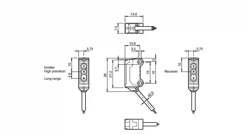 Thru-beam sensor (pair). Thru-beam sensor for standard applications, miniature design, 2000 mm detection range, red light, dark on, NPN output, 2 m fixed cable, 45° cable outlet for maximum mounting freedom under extremely tight space constraints, Extremely large detection range in Long Range Mode, Option of switching to high precision mode for greater switching accuracy. Emitter: OBE2000-R3-S-P. Receiver: OBE2000-R3-E0-P. Effective detection range: Long range mode: 0 … 2 m High precision mode: 0 … 200 mm. Threshold detection range: Long range mode: 2.5 m High precision mode: 300 mm. Light source: LED. Light type: modulated visible red light , 630 nm. Angle deviation: approx. 2 °. Diameter of the light spot: Long range mode: 150 mm at a distance of 2000 mm High precision mode: 0.5 mm at a distance of 50 mm. Opening angle: approx. 2 °. Optical face: frontal. Ambient light limit: EN 60947-5-2 : 30000 Lux. MTTFd: 806 a. Mission Time (TM): 20 a. Diagnostic Coverage (DC): 0 %. Operation indicator: LED green, statically lit Power on , short-circuit : LED green flashing (approx. 4 Hz). Function indicator: Receiver: LED yellow, lights up when light beam is free, flashes when falling short of the operating reserve ; OFF when light beam is interrupted. Operating voltage: 10 … 30 V DC , class 2. No-load supply current: Emitter: ≤ 11 mA Receiver: ≤ 8 mA. Control input: Emitter selection BK: not connected, Long Range mode BK: 0 V, High Precision Mode. Switching threshold: Teach-In input. Switching type: NO contact / dark on. Signal output: 1 NPN output, short-circuit protected, reverse polarity protected, open collector. Switching voltage: max. 30 V DC. Switching current: max. 50 mA , resistive load. Voltage drop: ≤ 1.5 V DC. Switching frequency: approx. 800 Hz. Response time: 600 µs. Product standard: EN 60947-5-2. UL approval: cULus Recognized, Class 2 Power Source. CCC approval: CCC approval / marking not required for products rated ≤36 V. Ambient temperature: -25 … 60 °C (-13 … 140 °F). Storage temperature: -30 … 70 °C (-22 … 158 °F). Degree of protection: IP67. Connection: 2 m fixed cable. Material: . HousingPC/ABS and TPUOptical facePCCablePUR: . Housing: PC/ABS and TPU. Optical face: PC. Cable: PUR. Mass: approx. 20 g per sensor. Dimensions: . Height26 mmWidth7.5 mmDepth13.8 mm: . Height: 26 mm. Width: 7.5 mm. Depth: 13.8 mm. Cable length: 2 m