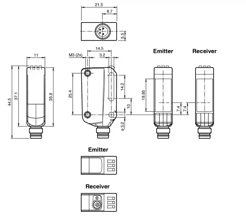 Thru-beam sensor (pair). Laser thru-beam sensor, Miniature design with versatile mounting options, DuraBeam Laser Sensors – durable and employable like an LED, IO-Link interface for service and process data, Various frequencies for avoiding mutual interference (cross-talk immunity), Extended temperature range-40 °C … 60 °C. Emitter: OBE20M-R100-S-IO-V31-L. Receiver: OBE20M-R100-2EP-IO-V31-L. Effective detection range: 0 … 20 m. Threshold detection range: 30 m. Light source: laser diode. Light type: modulated visible red light. Laser nominal ratings: . NoteLASER LIGHT , DO NOT STARE INTO BEAMLaser class1Wave length680 nmBeam divergence> 5 mrad ; d63 5 mrad ; d63 < 2 mm in the range of 250 mm … 750 mm. Pulse length: 1.6 µs. Repetition rate: max. 17.6 kHz. max. pulse energy: 9.6 nJ. Diameter of the light spot: approx. 50 mm at a distance of 20 m. Opening angle: approx. 0.3 °. Ambient light limit: EN 60947-5-2 : 30000 Lux. MTTFd: 440 a. Mission Time (TM): 20 a. Diagnostic Coverage (DC): 0 %. Operation indicator: LED green:constantly on – power onflashing (4Hz) – short circuitflashing with short break (1 Hz) – IO-Link mode. Function indicator: Yellow LED:Permanently lit – light path clearPermanently off – object detectedFlashing (4 Hz) – insufficient operating reserve. Control elements: Receiver: light/dark switch. Control elements: Receiver: sensitivity adjustment. Parameterization indicator: IO link communication: green LED goes out briefly (1 Hz). Operating voltage: 10 … 30 V DC. Ripple: max. 10 %. No-load supply current: Emitter: ≤ 13 mA Receiver: ≤ 13 mA at 24 V supply voltage. Protection class: III. Interface type: IO-Link ( via C/Q = pin 4 ). IO-Link revision: 1.1. Device ID: Emitter: 0x110402 (1115138)Reciever: 0x110302 (1114882). Transfer rate: COM2 (38.4 kBit/s). Min. cycle time: 2.3 ms. Process data width: Emitter:Process data output: 2 BitReceiver:Process data input: 2 BitProcess data output: 2 Bit. SIO mode support: yes. Compatible master port type: A. Test input: emitter deactivation at +UB. Switching type: The switching type of the sensor is adjustable. The default setting is: C/Q – Pin4: NPN normally open / dark-on, PNP normally closed / light-on, IO-Link /Q – Pin2: NPN normally closed / light-on, PNP normally open / dark-on. Signal output: 2 push-pull (4 in 1) outputs, short-circuit protected, reverse polarity protected, overvoltage protected. Switching voltage: max. 30 V DC. Switching current: max. 100 mA , resistive load. Usage category: DC-12 and DC-13. Voltage drop: ≤ 1.5 V DC. Switching frequency: 1250 Hz. Response time: 0.4 ms. Communication interface: IEC 61131-9. Product standard: EN 60947-5-2. Laser safety: EN 60825-1:2014. UL approval: E87056 , cULus Listed , class 2 power supply , type rating 1. FDA approval: IEC 60825-1:2014 Complies with 21 CFR 1040.10 and 1040.11 except for conformance with IEC 60825-1 Ed. 3 as described in Laser Notice 56, dated May 8, 2019.. Ambient temperature: -40 … 60 °C (-40 … 140 °F). Storage temperature: -40 … 70 °C (-40 … 158 °F). Degree of protection: IP67 / IP69 / IP69K. Connection: M8 x 1 connector, 4-pin. Material: . HousingPC (Polycarbonate)Optical facePMMA: . Housing: PC (Polycarbonate). Optical face: PMMA. Mass: Emitter: approx. 10 g receiver: approx. 10 g. Dimensions: . Height44.5 mmWidth11 mmDepth21.5 mm: . Height: 44.5 mm. Width: 11 mm. Depth: 21.5 mm