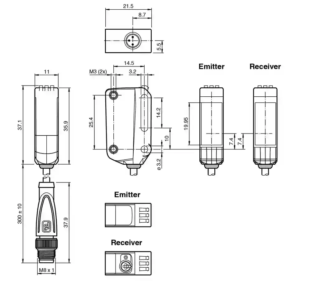 Thru-beam sensor (pair). Laser thru-beam sensor, Miniature design with versatile mounting options, DuraBeam Laser Sensors – durable and employable like an LED, IO-Link interface for service and process data, Various frequencies for avoiding mutual interference (cross-talk immunity), Extended temperature range-40 °C … 60 °C. Emitter: OBE20M-R100-S-IO-0,3M-V3-L. Receiver: OBE20M-R100-EP-IO-0,3M-V3-L. Effective detection range: 0 … 20 m. Threshold detection range: 30 m. Light source: laser diode. Light type: modulated visible red light. Laser nominal ratings: . NoteLASER LIGHT , DO NOT STARE INTO BEAMLaser class1Wave length680 nmBeam divergence> 5 mrad ; d63 5 mrad ; d63 < 2 mm in the range of 250 mm … 750 mm. Pulse length: 1.6 µs. Repetition rate: max. 17.6 kHz. max. pulse energy: 9.6 nJ. Diameter of the light spot: approx. 50 mm at a distance of 20 m. Opening angle: approx. 0.3 °. Ambient light limit: EN 60947-5-2 : 30000 Lux. MTTFd: 440 a. Mission Time (TM): 20 a. Diagnostic Coverage (DC): 0 %. Operation indicator: LED green:constantly on – power onflashing (4Hz) – short circuitflashing with short break (1 Hz) – IO-Link mode. Function indicator: Yellow LED:Permanently lit – light path clearPermanently off – object detectedFlashing (4 Hz) – insufficient operating reserve. Control elements: Receiver: light/dark switch. Control elements: Receiver: sensitivity adjustment. Parameterization indicator: IO link communication: green LED goes out briefly (1 Hz). Operating voltage: 10 … 30 V DC. Ripple: max. 10 %. No-load supply current: Emitter: ≤ 13 mA Receiver: ≤ 13 mA at 24 V supply voltage. Protection class: III. Interface type: IO-Link ( via C/Q = pin 4 ). IO-Link revision: 1.1. Device ID: Emitter: 0x110402 (1115138)Reciever: 0x110302 (1114882). Transfer rate: COM2 (38.4 kBit/s). Min. cycle time: 2.3 ms. Process data width: Emitter:Process data output: 2 BitReceiver:Process data input: 2 BitProcess data output: 2 Bit. SIO mode support: yes. Compatible master port type: A. Test input: emitter deactivation at +UB. Switching type: The switching type of the sensor is adjustable. The default setting is: C/Q – Pin4: NPN normally open / dark-on, PNP normally closed / light-on, IO-Link. Signal output: 1 push-pull (4 in 1) output, short-circuit protected, reverse polarity protected, overvoltage protected. Switching voltage: max. 30 V DC. Switching current: max. 100 mA , resistive load. Usage category: DC-12 and DC-13. Voltage drop: ≤ 1.5 V DC. Switching frequency: 1250 Hz. Response time: 0.4 ms. Communication interface: IEC 61131-9. Product standard: EN 60947-5-2. Laser safety: EN 60825-1:2014. UL approval: E87056 , cULus Listed , class 2 power supply , type rating 1. FDA approval: IEC 60825-1:2014 Complies with 21 CFR 1040.10 and 1040.11 except for conformance with IEC 60825-1 Ed. 3 as described in Laser Notice 56, dated May 8, 2019.. Ambient temperature: -40 … 60 °C (-40 … 140 °F) , cable, fixed installation -25 … 60 °C (-13 … 140 °F) , movable cable not appropriate for conveyor chains. Storage temperature: -40 … 70 °C (-40 … 158 °F). Degree of protection: IP67 / IP69 / IP69K. Connection: 300 mm fixed cable with M8 x 1, 3-pin connector. Material: . HousingPC (Polycarbonate)Optical facePMMA: . Housing: PC (Polycarbonate). Optical face: PMMA. Mass: Emitter: approx. 10 g receiver: approx. 10 g. Dimensions: . Height37.1 mmWidth11 mmDepth21.5 mm: . Height: 37.1 mm. Width: 11 mm. Depth: 21.5 mm. Cable length: 0.3 m