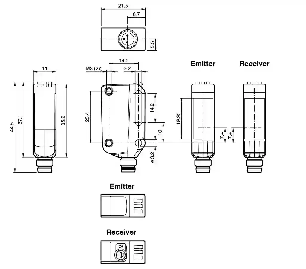 Thru-beam sensor (pair). Laser thru-beam sensor, Miniature design with versatile mounting options, DuraBeam Laser Sensors – durable and employable like an LED, IO-Link interface for service and process data, Various frequencies for avoiding mutual interference (cross-talk immunity), Extended temperature range-40 °C … 60 °C. Emitter: OBE20M-R100-S-IO-V3-L. Receiver: OBE20M-R100-EP-IO-V3-L. Effective detection range: 0 … 20 m. Threshold detection range: 30 m. Light source: laser diode. Light type: modulated visible red light. Laser nominal ratings: . NoteLASER LIGHT , DO NOT STARE INTO BEAMLaser class1Wave length680 nmBeam divergence> 5 mrad ; d63 5 mrad ; d63 < 2 mm in the range of 250 mm … 750 mm. Pulse length: 1.6 µs. Repetition rate: max. 17.6 kHz. max. pulse energy: 9.6 nJ. Diameter of the light spot: approx. 50 mm at a distance of 20 m. Opening angle: approx. 0.3 °. Ambient light limit: EN 60947-5-2 : 30000 Lux. MTTFd: 440 a. Mission Time (TM): 20 a. Diagnostic Coverage (DC): 0 %. Operation indicator: LED green:constantly on – power onflashing (4Hz) – short circuitflashing with short break (1 Hz) – IO-Link mode. Function indicator: Yellow LED:Permanently lit – light path clearPermanently off – object detectedFlashing (4 Hz) – insufficient operating reserve. Control elements: Receiver: light/dark switch. Control elements: Receiver: sensitivity adjustment. Parameterization indicator: IO link communication: green LED goes out briefly (1 Hz). Operating voltage: 10 … 30 V DC. Ripple: max. 10 %. No-load supply current: Emitter: ≤ 13 mA Receiver: ≤ 13 mA at 24 V supply voltage. Protection class: III. Interface type: IO-Link ( via C/Q = pin 4 ). IO-Link revision: 1.1. Device ID: Emitter: 0x110402 (1115138)Reciever: 0x110302 (1114882). Transfer rate: COM2 (38.4 kBit/s). Min. cycle time: 2.3 ms. Process data width: Emitter:Process data output: 2 BitReceiver:Process data input: 2 BitProcess data output: 2 Bit. SIO mode support: yes. Compatible master port type: A. Test input: emitter deactivation at +UB. Switching type: The switching type of the sensor is adjustable. The default setting is: C/Q – Pin4: NPN normally open / dark-on, PNP normally closed / light-on, IO-Link. Signal output: 1 push-pull (4 in 1) output, short-circuit protected, reverse polarity protected, overvoltage protected. Switching voltage: max. 30 V DC. Switching current: max. 100 mA , resistive load. Usage category: DC-12 and DC-13. Voltage drop: ≤ 1.5 V DC. Switching frequency: 1250 Hz. Response time: 0.4 ms. Communication interface: IEC 61131-9. Product standard: EN 60947-5-2. Laser safety: EN 60825-1:2014. UL approval: E87056 , cULus Listed , class 2 power supply , type rating 1. FDA approval: IEC 60825-1:2014 Complies with 21 CFR 1040.10 and 1040.11 except for conformance with IEC 60825-1 Ed. 3 as described in Laser Notice 56, dated May 8, 2019.. Ambient temperature: -40 … 60 °C (-40 … 140 °F). Storage temperature: -40 … 70 °C (-40 … 158 °F). Degree of protection: IP67 / IP69 / IP69K. Connection: M8 x 1 connector, 3-pin. Material: . HousingPC (Polycarbonate)Optical facePMMA: . Housing: PC (Polycarbonate). Optical face: PMMA. Mass: Emitter: approx. 10 g receiver: approx. 10 g. Dimensions: . Height37.1 mmWidth11 mmDepth21.5 mm: . Height: 37.1 mm. Width: 11 mm. Depth: 21.5 mm