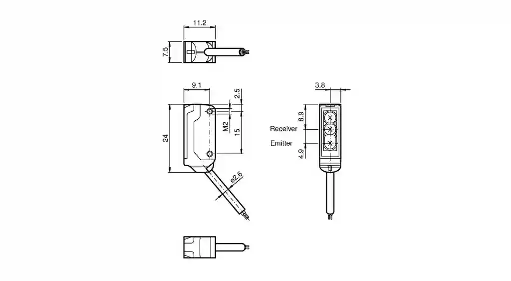 Retroreflective sensor. Retroreflective sensor for standard applications, miniature design, polarization filter, 1000 mm detection range, red light, dark on, NPN output, 2 m fixed cable, Ultra-small housing design, 45° cable outlet for maximum mounting freedom under extremely tight space constraints, Integrated polarization filter allows the detection of reflective objects, Extremely long detection range paves the way for new applications. Effective detection range: 0 … 1 m. Reflector distance: 40 … 1000 mm. Threshold detection range: 1.4 m. Reference target: H40 reflector. Light source: LED. Light type: modulated visible red light , 630 nm. Polarization filter: yes. Angle deviation: approx. 2 °. Diameter of the light spot: approx. 60 mm at a distance of 800 mm. Opening angle: approx. 2 °. Optical face: frontal. Ambient light limit: EN 60947-5-2 : 30000 Lux. MTTFd: 800 a. Mission Time (TM): 20 a. Diagnostic Coverage (DC): 0 %. Operation indicator: LED green, statically lit Power on , short-circuit : LED green flashing (approx. 4 Hz). Function indicator: LED yellow: lights up when receiving the light beam ; flashes when falling short of the operating reserve; OFF when light beam is interrupted. Operating voltage: 10 … 30 V DC , class 2. No-load supply current: < 10 mA. Test input: Test of switching function at 0 V. Switching type: NO contact / dark-on. Signal output: 1 NPN output, short-circuit protected, reverse polarity protected, open collector. Switching voltage: max. 30 V DC. Switching current: max. 50 mA. Voltage drop: ≤ 1.5 V DC. Switching frequency: approx. 800 Hz. Response time: 600 µs. Product standard: EN 60947-5-2. UL approval: cULus Recognized, Class 2 Power Source. CCC approval: CCC approval / marking not required for products rated ≤36 V. Ambient temperature: -25 … 60 °C (-13 … 140 °F). Storage temperature: -30 … 70 °C (-22 … 158 °F). Degree of protection: IP67. Connection: 2 m fixed cable. Material: . HousingPC/ABS and TPUOptical facePMMACablePUR: . Housing: PC/ABS and TPU. Optical face: PMMA. Cable: PUR. Installation: Fixing screws , 2 x M2 allen head screws included with delivery. Mass: approx. 20 g. Dimensions: . Height24 mmWidth7.5 mmDepth11.2 mm: . Height: 24 mm. Width: 7.5 mm. Depth: 11.2 mm. Cable length: 2 m