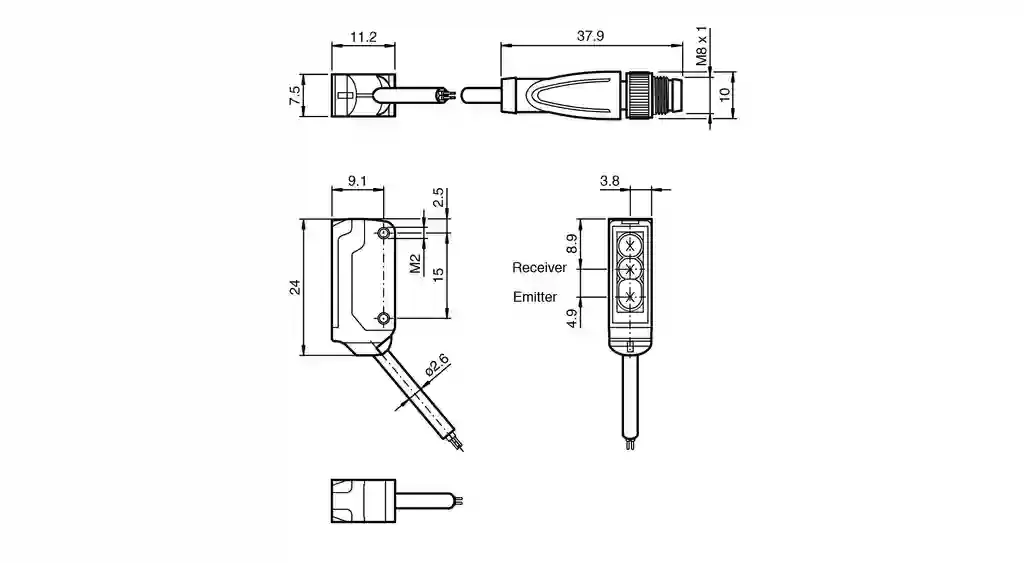 Retroreflective sensor. Laser retroreflective sensor, ultra-small design with M2 mounting, polarization filter, 2000 mm detection range, dark on, NPN output, 200 mm fixed cable with plug M8, 4-pin, Ultra-small housing design, DuraBeam Laser Sensors – durable and employable like an LED, 45° cable outlet for maximum mounting freedom under extremely tight space constraints. Effective detection range: 0 … 2 m. Reflector distance: 40 … 2000 mm. Threshold detection range: 2.3 m. Reference target: H40 reflector. Light source: laser diode. Light type: modulated visible red light , 680 nm. Polarization filter: yes. Laser nominal ratings: . NoteLASER LIGHT , DO NOT STARE INTO BEAMLaser class1Wave length680 nmBeam divergence> 5 mradPulse lengthapprox. 3 µsRepetition rateapprox. 16.6 kHzmax. pulse energy8 nJ: . Note: LASER LIGHT , DO NOT STARE INTO BEAM. Laser class: 1. Wave length: 680 nm. Beam divergence: > 5 mrad. Pulse length: approx. 3 µs. Repetition rate: approx. 16.6 kHz. max. pulse energy: 8 nJ. Diameter of the light spot: approx. 35 mm at a distance of 2000 mm. Opening angle: approx. 0.5 °. Optical face: frontal. Ambient light limit: EN 60947-5-2 : 30000 Lux. MTTFd: 800 a. Mission Time (TM): 20 a. Diagnostic Coverage (DC): 0 %. Operation indicator: LED green, statically lit Power on , short-circuit : LED green flashing (approx. 4 Hz). Function indicator: LED yellow: lights up when receiving the light beam ; flashes when falling short of the operating reserve; OFF when light beam is interrupted. Operating voltage: 12 … 24 V. No-load supply current: < 10 mA. Protection class: III. Switching type: NO contact / dark-on. Signal output: 1 NPN output, short-circuit protected, reverse polarity protected, open collector. Switching voltage: max. 30 V DC. Switching current: max. 50 mA , resistive load. Voltage drop: ≤ 1.5 V DC. Switching frequency: approx. 2 kHz. Response time: 250 µs. Product standard: EN 60947-5-2. Laser safety: EN 60825-1:2007. UL approval: E87056 , cULus Recognized, Class 2 Power Source. CCC approval: CCC approval / marking not required for products rated ≤36 V. FDA approval: IEC 60825-1:2007 Complies with 21 CFR 1040.10 and 1040.11 except for deviations pursuant to Laser Notice No. 50, dated June 24, 2007. Ambient temperature: -20 … 60 °C (-4 … 140 °F). Storage temperature: -30 … 70 °C (-22 … 158 °F). Degree of protection: IP67. Connection: 200 mm fixed cable with 4-pin, M8x1 connector. Material: . HousingPC/ABS and TPUOptical facePMMACablePUR: . Housing: PC/ABS and TPU. Optical face: PMMA. Cable: PUR. Installation: Fixing screws , 2 x M2 allen head screws included with delivery. Mass: approx. 10 g. Dimensions: . Height24 mmWidth7.5 mmDepth11.2 mm: . Height: 24 mm. Width: 7.5 mm. Depth: 11.2 mm. Cable length: 200 mm