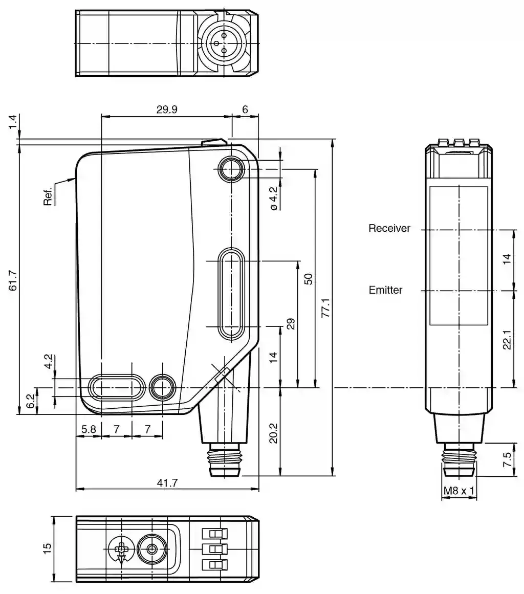 Laser retroreflective sensor. Laser retroreflective sensor, Medium design with versatile mounting options, DuraBeam Laser Sensors – durable and employable like an LED, Extended temperature range-40 °C … 60 °C, High degree of protection IP69K, IO-Link interface for service and process data. Effective detection range: 0 … 25 m. Reflector distance: 0.5 … 25 m. Threshold detection range: 33 m. Reference target: H85-2 reflector. Light source: laser diode. Light type: modulated visible red light. Polarization filter: yes. Laser nominal ratings: . NoteLASER LIGHT , DO NOT STARE INTO BEAMLaser class1Wave length680 nmBeam divergence> 5 mrad d63 5 mrad d63 < 2 mm in the range of 250 mm … 750 mm. Pulse length: 1.6 µs. Repetition rate: max. 17.6 kHz. max. pulse energy: 9.6 nJ. Diameter of the light spot: approx. 50 mm at a distance of 25 m. Opening angle: approx. 0.1 °. Ambient light limit: EN 60947-5-2 : 60000 Lux. MTTFd: 672 a. Mission Time (TM): 20 a. Diagnostic Coverage (DC): 0 %. Operation indicator: LED green:constantly on – power onflashing (4Hz) – short circuitflashing with short break (1 Hz) – IO-Link mode. Function indicator: Yellow LED:Permanently lit – light path clearPermanently off – object detectedFlashing (4 Hz) – insufficient operating reserve. Control elements: Light-on/dark-on changeover switch. Control elements: sensitivity adjustment. Operating voltage: 10 … 30 V DC. Ripple: max. 10 %. No-load supply current: < 15 mA at 24 V Operating voltage. Protection class: III. Interface type: IO-Link ( via C/Q = pin 4 ). IO-Link revision: 1.1. Device profile: Identification and diagnosisSmart Sensor type 2.4. Device ID: 0x111212 (1118738). Transfer rate: COM2 (38.4 kBit/s). Min. cycle time: 2.3 ms. Process data width: Process data input 2 BitProcess data output 2 Bit. SIO mode support: yes. Compatible master port type: A. Switching type: The switching type of the sensor is adjustable. The default setting is: C/Q – Pin4: NPN normally open / dark-on, PNP normally closed / light-on, IO-Link. Signal output: 1 push-pull (4 in 1) output, short-circuit protected, reverse polarity protected, overvoltage protected. Switching voltage: max. 30 V DC. Switching current: max. 100 mA , resistive load. Usage category: DC-12 and DC-13. Voltage drop: ≤ 1.5 V DC. Switching frequency: 2000 Hz. Response time: 250 µs. Communication interface: IEC 61131-9. Product standard: EN 60947-5-2. Laser safety: EN 60825-1:2014. UL approval: E87056 , cULus Listed , class 2 power supply , type rating 1. CCC approval: CCC approval / marking not required for products rated ≤36 V. FDA approval: IEC 60825-1:2014 Complies with 21 CFR 1040.10 and 1040.11 except for conformance with IEC 60825-1 Ed. 3 as described in Laser Notice 56, dated May 8, 2019.. Ambient temperature: -40 … 60 °C (-40 … 140 °F). Storage temperature: -40 … 70 °C (-40 … 158 °F). Degree of protection: IP67 / IP69 / IP69K. Connection: Connector plug, M8 x 1, 3 pin, rotatable by 90°. Material: . HousingPC (Polycarbonate)Optical facePMMA: . Housing: PC (Polycarbonate). Optical face: PMMA. Mass: approx. 44 g. Dimensions: . Height61.7 mmWidth15 mmDepth41.7 mm: . Height: 61.7 mm. Width: 15 mm. Depth: 41.7 mm