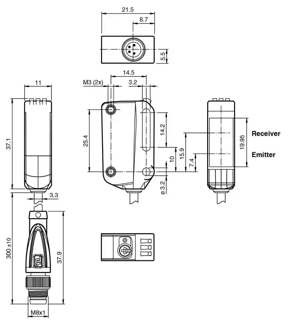 Triangulation sensor (BGS). Laser diffuse mode sensor with adjustable background suppression, Miniature design with versatile mounting options, DuraBeam Laser Sensors – durable and employable like an LED, Extended temperature range-40 °C … 60 °C, High degree of protection IP69K, IO-Link interface for service and process data. Detection range: 7 … 100 mm. Detection range min.: 7 … 25 mm. Detection range max.: 7 … 100 mm. Adjustment range: 25 … 100 mm. Reference target: standard white, 100 mm x 100 mm. Light source: laser diode. Light type: modulated visible red light. Laser nominal ratings: . NoteLASER LIGHT , DO NOT STARE INTO BEAMLaser class1Wave length680 nmBeam divergence> 5 mrad d63 5 mrad d63 < 1 mm in the range of 150 mm … 250 mm. Pulse length: 3 µs. Repetition rate: approx. 13 kHz. max. pulse energy: 10.4 nJ. Black-white difference (6 %/90 %): < 5 % at 80 mm. Diameter of the light spot: < 1 mm at a distance of 60 mm. Opening angle: approx. 0.3 °. Ambient light limit: EN 60947-5-2 : 40000 Lux. MTTFd: 560 a. Mission Time (TM): 20 a. Diagnostic Coverage (DC): 0 %. Operation indicator: LED green:constantly on – power onflashing (4Hz) – short circuitflashing with short break (1 Hz) – IO-Link mode. Function indicator: LED yellow:constantly on – object detectedconstantly off – object not detected. Control elements: Light-on/dark-on changeover switch. Control elements: Sensing range adjuster. Operating voltage: 10 … 30 V DC. Ripple: max. 10 %. No-load supply current: < 20 mA at 24 V supply voltage. Protection class: III. Interface type: IO-Link ( via C/Q = pin 4 ). IO-Link revision: 1.1. Device profile: Smart Sensor. Device ID: 0x110603 (1115651). Transfer rate: COM2 (38.4 kBit/s). Min. cycle time: 2.3 ms. Process data width: Process data input 1 BitProcess data output 2 Bit. SIO mode support: yes. Compatible master port type: A. Switching type: The switching type of the sensor is adjustable. The default setting is: C/Q – Pin4: NPN normally open / light-on, PNP normally closed / dark-on, IO-Link /Q – Pin2: NPN normally closed / dark-on, PNP normally open / light-on. Signal output: 2 push-pull (4 in 1) outputs, short-circuit protected, reverse polarity protected, overvoltage protected. Switching voltage: max. 30 V DC. Switching current: max. 100 mA , resistive load. Usage category: DC-12 and DC-13. Voltage drop: ≤ 1.5 V DC. Switching frequency: 1650 Hz. Response time: 300 µs. Communication interface: IEC 61131-9. Product standard: EN 60947-5-2. Laser safety: EN 60825-1:2014. UL approval: E87056 , cULus Listed , class 2 power supply , type rating 1. FDA approval: IEC 60825-1:2014 Complies with 21 CFR 1040.10 and 1040.11 except for conformance with IEC 60825-1 Ed. 3 as described in Laser Notice 56, dated May 8, 2019.. Ambient temperature: -40 … 60 °C (-40 … 140 °F) , cable, fixed installation -25 … 60 °C (-13 … 140 °F) , movable cable not appropriate for conveyor chains. Storage temperature: -40 … 70 °C (-40 … 158 °F). Degree of protection: IP67 / IP69 / IP69K. Connection: fixed cable 300 mm with M8 x 1 male connector; 4-pin. Material: . HousingPC (Polycarbonate)Optical facePMMA: . Housing: PC (Polycarbonate). Optical face: PMMA. Mass: approx. 17 g. Dimensions: . Height37.1 mmWidth11 mmDepth21.5 mm: . Height: 37.1 mm. Width: 11 mm. Depth: 21.5 mm. Cable length: 0.3 m