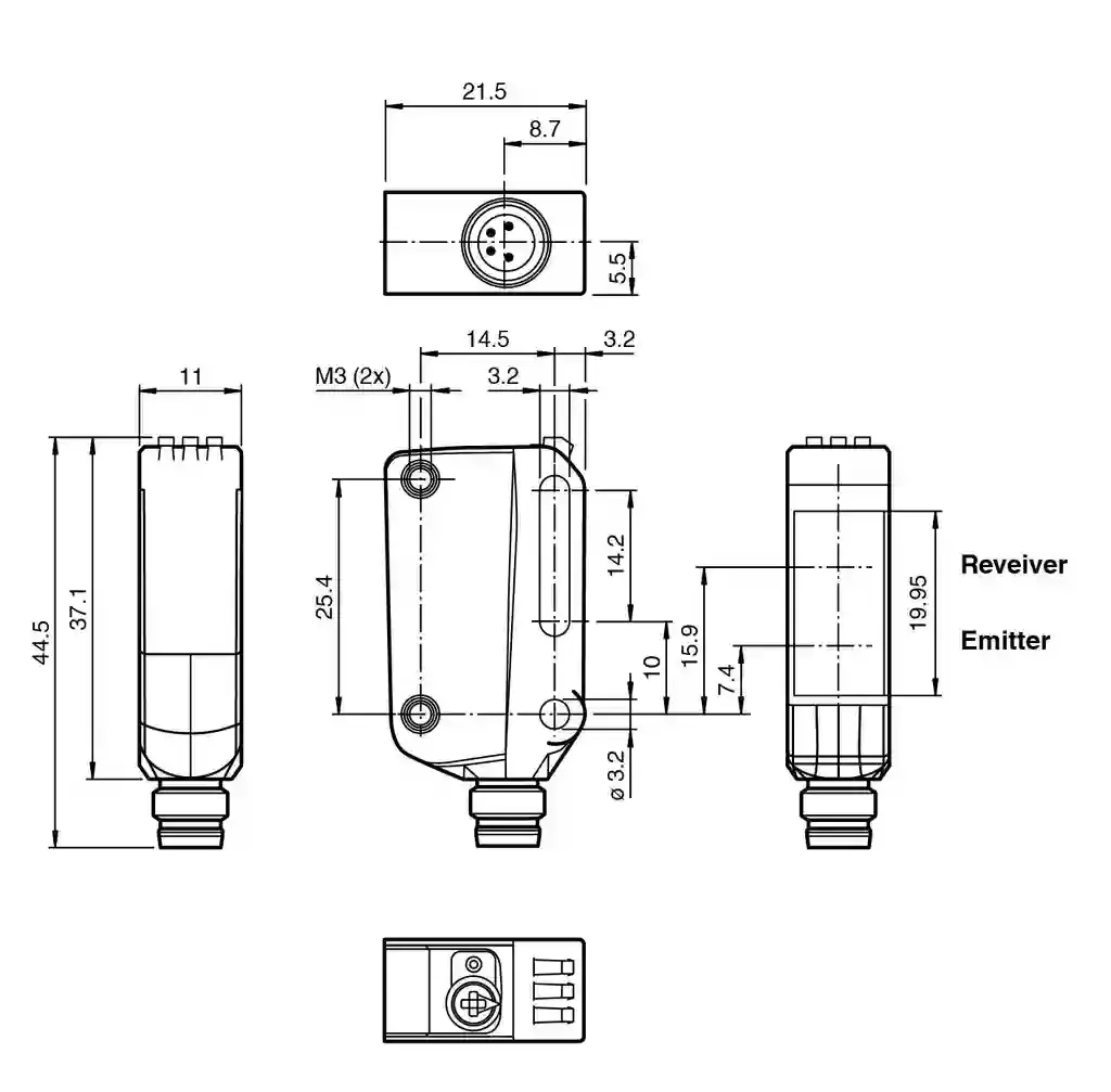 Triangulation sensor (BGS). Laser diffuse mode sensor with adjustable background suppression, Miniature design with versatile mounting options, DuraBeam Laser Sensors – durable and employable like an LED, Extended temperature range-40 °C … 60 °C, High degree of protection IP69K, IO-Link interface for service and process data. Detection range: 7 … 100 mm. Detection range min.: 7 … 25 mm. Detection range max.: 7 … 100 mm. Adjustment range: 25 … 100 mm. Reference target: standard white, 100 mm x 100 mm. Light source: laser diode. Light type: modulated visible red light. Laser nominal ratings: . NoteLASER LIGHT , DO NOT STARE INTO BEAMLaser class1Wave length680 nmBeam divergence> 5 mrad d63 5 mrad d63 < 1 mm in the range of 150 mm … 250 mm. Pulse length: 3 µs. Repetition rate: approx. 13 kHz. max. pulse energy: 10.4 nJ. Black-white difference (6 %/90 %): < 5 % at 80 mm. Diameter of the light spot: < 1 mm at a distance of 60 mm. Opening angle: approx. 0.3 °. Ambient light limit: EN 60947-5-2 : 40000 Lux. MTTFd: 560 a. Mission Time (TM): 20 a. Diagnostic Coverage (DC): 0 %. Operation indicator: LED green:constantly on – power onflashing (4Hz) – short circuitflashing with short break (1 Hz) – IO-Link mode. Function indicator: LED yellow:constantly on – object detectedconstantly off – object not detected. Control elements: Light-on/dark-on changeover switch. Control elements: Sensing range adjuster. Operating voltage: 10 … 30 V DC. Ripple: max. 10 %. No-load supply current: < 20 mA at 24 V supply voltage. Protection class: III. Interface type: IO-Link ( via C/Q = pin 4 ). IO-Link revision: 1.1. Device profile: Smart Sensor. Device ID: 0x110603 (1115651). Transfer rate: COM2 (38.4 kBit/s). Min. cycle time: 2.3 ms. Process data width: Process data input 1 BitProcess data output 2 Bit. SIO mode support: yes. Compatible master port type: A. Switching type: The switching type of the sensor is adjustable. The default setting is: C/Q – Pin4: NPN normally open / light-on, PNP normally closed / dark-on, IO-Link /Q – Pin2: NPN normally closed / dark-on, PNP normally open / light-on. Signal output: 2 push-pull (4 in 1) outputs, short-circuit protected, reverse polarity protected, overvoltage protected. Switching voltage: max. 30 V DC. Switching current: max. 100 mA , resistive load. Usage category: DC-12 and DC-13. Voltage drop: ≤ 1.5 V DC. Switching frequency: 1650 Hz. Response time: 300 µs. Communication interface: IEC 61131-9. Product standard: EN 60947-5-2. Laser safety: EN 60825-1:2014. UL approval: E87056 , cULus Listed , class 2 power supply , type rating 1. FDA approval: IEC 60825-1:2014 Complies with 21 CFR 1040.10 and 1040.11 except for conformance with IEC 60825-1 Ed. 3 as described in Laser Notice 56, dated May 8, 2019.. Ambient temperature: -40 … 60 °C (-40 … 140 °F). Storage temperature: -40 … 70 °C (-40 … 158 °F). Degree of protection: IP67 / IP69 / IP69K. Connection: M8 x 1 connector, 4-pin. Material: . HousingPC (Polycarbonate)Optical facePMMA: . Housing: PC (Polycarbonate). Optical face: PMMA. Mass: approx. 10 g. Dimensions: . Height44.5 mmWidth11 mmDepth21.5 mm: . Height: 44.5 mm. Width: 11 mm. Depth: 21.5 mm