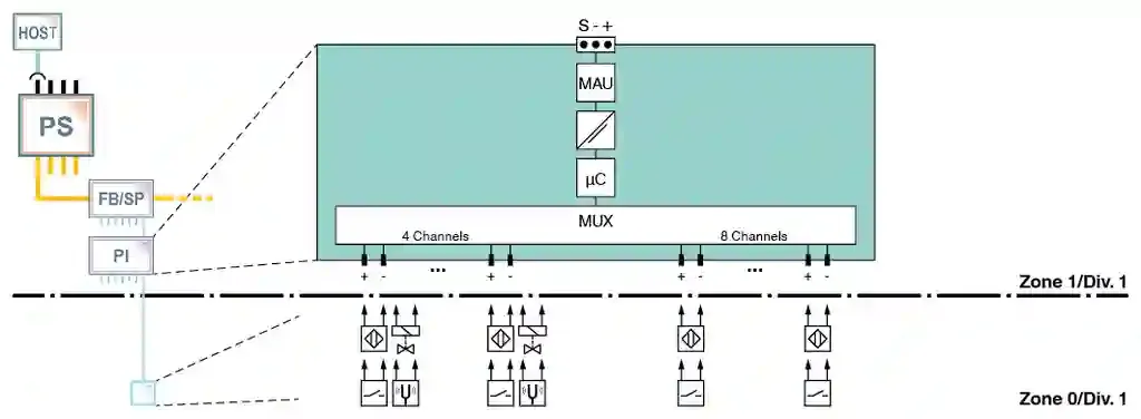 Multi-Input/Output. Multi-input/output for digital signals, module for DIN rail mounting, For discrete inputs and outputs, Installation in Zone 1/Div. 1, intrinsically safe, Sensors in Zone 0/Div. 1, Connection to fieldbus acc. to FISCO or Entity, For FOUNDATION Fieldbus H1, IECEx approval, Dust protection, International, Europe, USA, Canada, Device coupler location: non-explosion hazardous areaZone 2 – high-power trunkZone 1 – high-power trunkDivision 2 – high-power trunkDivision 1 – high-power trunk
