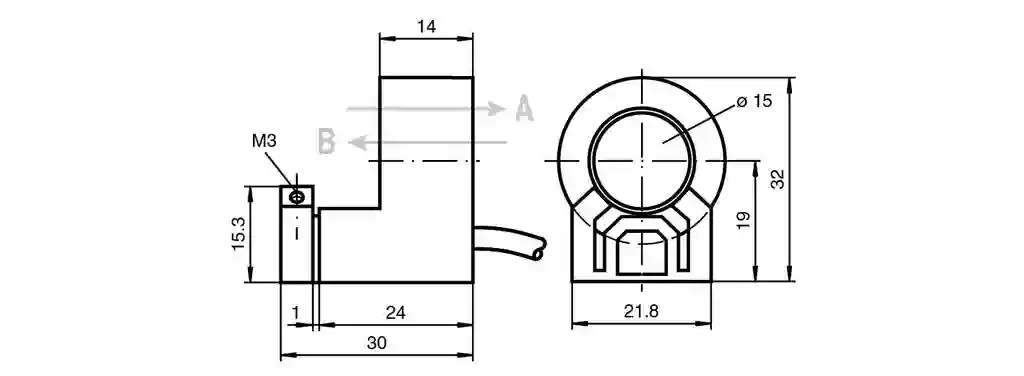 Inductive ring sensor. Switching function: Normally closed (NC), Output type: NAMUR, bistable, Output type: 2-wire, Construction type: Ring, Series: Ring Type, Type of voltage: DC, Equipment protection level Gb: PTB 99 ATEX 2128 X, Connection type: cable, Housing material: PBT, Degree of protection: IP67, Material: PVC. Switching function: Normally closed (NC). Output type: NAMUR, bistable. Inside diameter: 15 mm. Measuring cylinder: . Diameter1/4″ (6.250mm): . Diameter: 1/4″ (6.250mm). Measuring cone: Carboloy. Output type: 2-wire. Nominal voltage: 8.2 V (Ri approx. 1 kΩ). Hysteresis: typ. 1 %. Reverse polarity protection: reverse polarity protected. Current consumption: . Traverse B3 mAPassage B UB=8V≥ 3 mAPassage B UB=10V≥ 4.2 mATraverse A1 mAPassage A UB=10V0.5 … 1 mA typ. 0.9 mAPassage A UB=8V0.5 … 0.95 mA typ. 0.8 mA: . Traverse B: 3 mA. Passage B UB=8V: ≥ 3 mA. Passage B UB=10V: ≥ 4.2 mA. Traverse A: 1 mA. Passage A UB=10V: 0.5 … 1 mA typ. 0.9 mA. Passage A UB=8V: 0.5 … 0.95 mA typ. 0.8 mA. Time delay before availability: ≤ 5 ms. MTTFd: 2240 a. Mission Time (TM): 20 a. Diagnostic Coverage (DC): 0 %. Standard conformity: . NAMUREN 60947-5-6:2000 IEC 60947-5-6:1999StandardsEN IEC 60947-5-2: . NAMUR: EN 60947-5-6:2000 IEC 60947-5-6:1999. Standards: EN IEC 60947-5-2. ATEX approval: . Equipment protection level GbPTB 99 ATEX 2128 X: . Equipment protection level Gb: PTB 99 ATEX 2128 X. UL approval: cULus Listed Load Type: General Purpose Circuitry: Class 2 Power Source Enclosure Type Rating: Type 1 Supply/Switching Voltage: 8.2 V DC. Ambient temperature: -20 … 70 °C (-4 … 158 °F). Connection type: cable. Housing material: PBT. Degree of protection: IP67. Cable: . Bending radius> 10 x cable diameterMaterialPVCCore cross section0.14 mm2LengthL2 m: . Bending radius: > 10 x cable diameter. Material: PVC. Core cross section: 0.14 mm2. Length: 2 m. Dimensions: . Height32 mmWidth26 mmLength30 mm: . Height: 32 mm. Width: 26 mm. Length: 30 mm. Use in the hazardous area: see instruction manuals