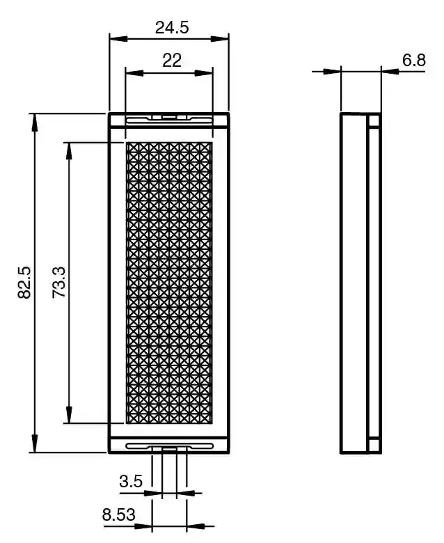 Reflector. Reflector. Construction type: rectangular. Ambient temperature: -20 … 60 °C (-4 … 140 °F). Material: PMMA/ABS. Dimensions: 87.3 mm x 25 mm x 15.5 mm. Height82.5 mmWidth24.5 mm: . Height…