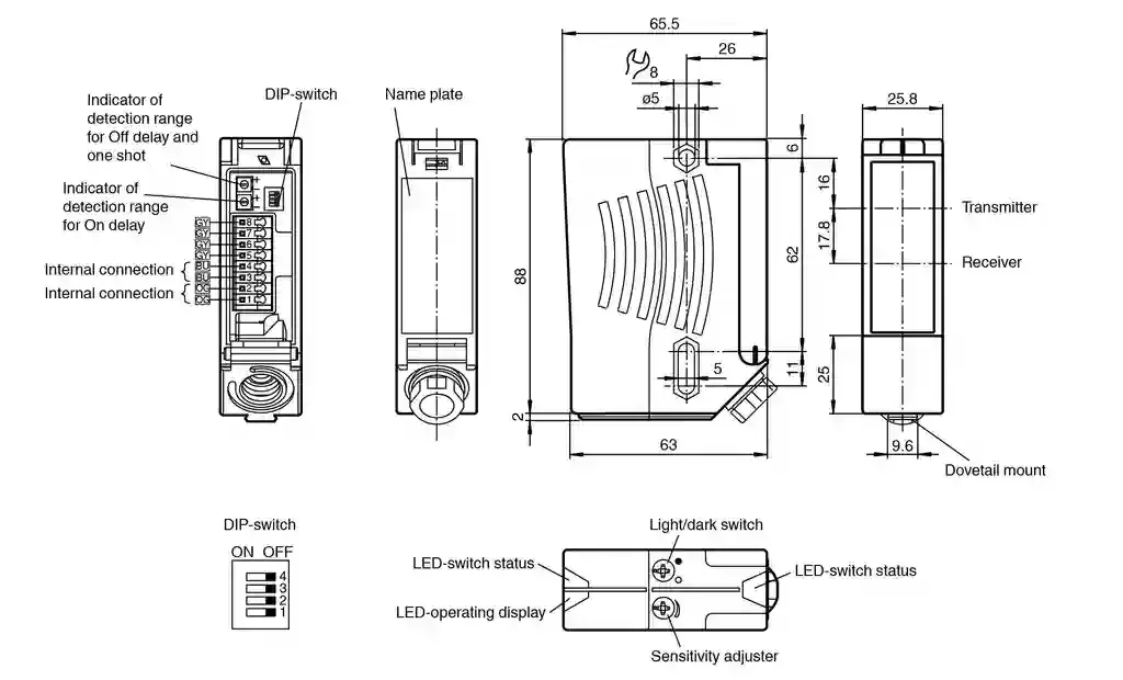 Retroreflective sensor. Retroreflective sensor with polarization filter, Ultra bright LEDs for power on, weak signal indication and switching state, Programmable time function GAN, GAB, IAB and GAN-IA…