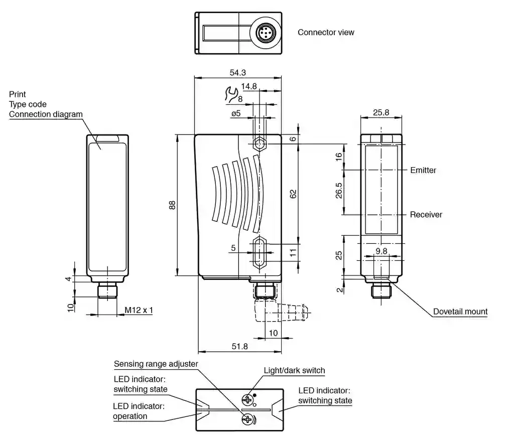Background suppression sensor. Background suppression sensor, Ultra bright LEDs for power on and switching state, Minimal black-white difference through the infrared transmission LED, Not sensitive to ambient light, even with energy saving lamps, Waterproof, degree of protection IP67, Protection class II. Detection range: 20 … 2000 mm. Detection range min.: 20 … 200 mm. Detection range max.: 20 … 2000 mm. Background suppression: max. + 10 % of the upper limit of the detection range. Light source: IRED. Light type: modulated infrared light , 880 nm. Black-white difference (6 %/90 %): < 40 %. Diameter of the light spot: approx. 70 mm at a distance of 2000 mm. Opening angle: transmitter 2°receiver 2°. Ambient light limit: 50000 Lux. MTTFd: 720 a. Mission Time (TM): 20 a. Diagnostic Coverage (DC): 0 %. Operation indicator: LED green. Function indicator: 2 LEDs yellowON: object inside the scanning rangeOFF: object outside the scanning range. Control elements: Sensing range adjuster , Light-on/dark-on changeover switch. Operating voltage: 10 … 30 V DC. Ripple: 10 %. No-load supply current: ≤ 40 mA. Switching type: light/dark on switchable. Signal output: 2 PNP, complementary, short-circuit protected, reverse polarity protected , open collectors. Switching voltage: max. 30 V DC. Switching current: max. 200 mA. Switching frequency: 250 Hz. Response time: 2 ms. Product standard: EN 60947-5-2. Protection class: II, rated voltage ≤ 250 V AC with pollution degree 1-2 according to IEC 60664-1. UL approval: E87056 , cULus Listed , class 2 power supply , type rating 1. Ambient temperature: -40 … 60 °C (-40 … 140 °F). Storage temperature: -40 … 60 °C (-40 … 140 °F). Degree of protection: IP67. Connection: 5-pin, M12 x 1 connector. Material: . HousingPlastic ABSOptical faceplasticConnectorplastic: . Housing: Plastic ABS. Optical face: plastic. Connector: plastic. Mass: 70 g. Dimensions: . Height88 mmWidth25.8 mmDepth54.3 mm: . Height: 88 mm. Width: 25.8 mm. Depth: 54.3 mm