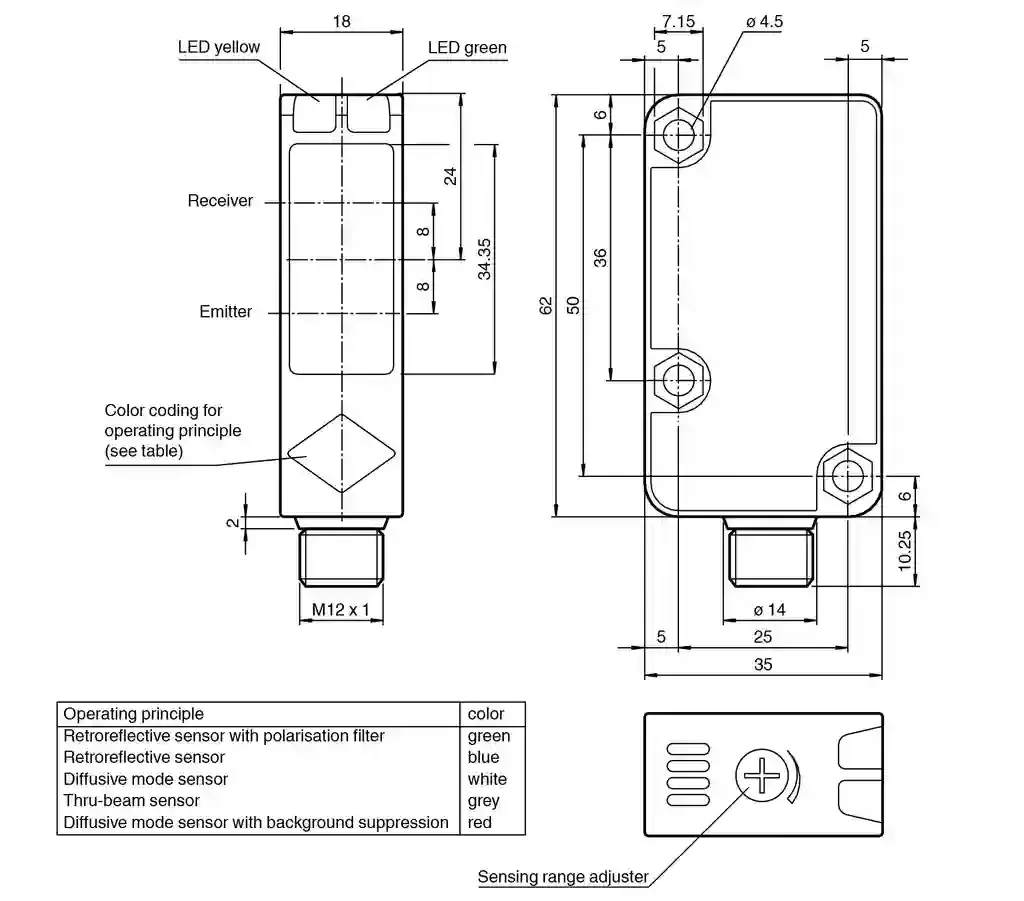 Diffuse mode sensor. Diffuse mode sensor, plastic housing, 1200 mm adjustable detection range, red light, light on, push-pull output, M12 plug, Highly visible LED, Powerful push-pull output, Red transmission light, Compact and stable housing, Protection class II. Detection range: 0 … 1200 mm adjustable. Detection range max.: 0 … 1200 mm. Reference target: standard white, 100 mm x 100 mm. Light source: LED. Light type: modulated visible red light , 630 nm. Diameter of the light spot: approx. 25 mm at a distance of 1.2 m. Opening angle: 2 °. Ambient light limit: 50000 Lux ; according to EN 60947-5-2. MTTFd: 920 a. Mission Time (TM): 20 a. Diagnostic Coverage (DC): 0 %. Operation indicator: LED green: power on. Function indicator: LED yellow, lights up with receiver lit. Control elements: Sensing range adjuster. Operating voltage: 10 … 30 V DC. Ripple: 10 %. No-load supply current: ≤ 20 mA. Switching type: light-on. Signal output: 2 push-pull (4 in 1) outputs, short-circuit protected, reverse polarity protected. Switching voltage: max. 30 V DC. Switching current: max. 100 mA. Voltage drop: ≤ 1.5 V. Switching frequency: ≤ 500 Hz. Response time: ≤ 1 ms. Product standard: EN 60947-5-2. Protection class: II , rated insulation voltage ≤ 250 V AC with pollution degree 1-2 according to IEC 60664-1 Output circuit basis insulation of input circuit according to EN 50178, rated insulation voltage 240 V AC. UL approval: cULus Listed, Class 2 Power Source, Type 1 enclosure. CCC approval: CCC approval / marking not required for products rated ≤36 V. Ambient temperature: -30 … 55 °C (-22 … 131 °F). Storage temperature: -40 … 70 °C (-40 … 158 °F). Degree of protection: IP67. Connection: 4-pin, M12 x 1 connector. Material: . HousingPolycarbonateOptical facePMMA: . Housing: Polycarbonate. Optical face: PMMA. Mass: 25 g. Dimensions: . Height62 mmWidth18 mmDepth35 mm: . Height: 62 mm. Width: 18 mm. Depth: 35 mm