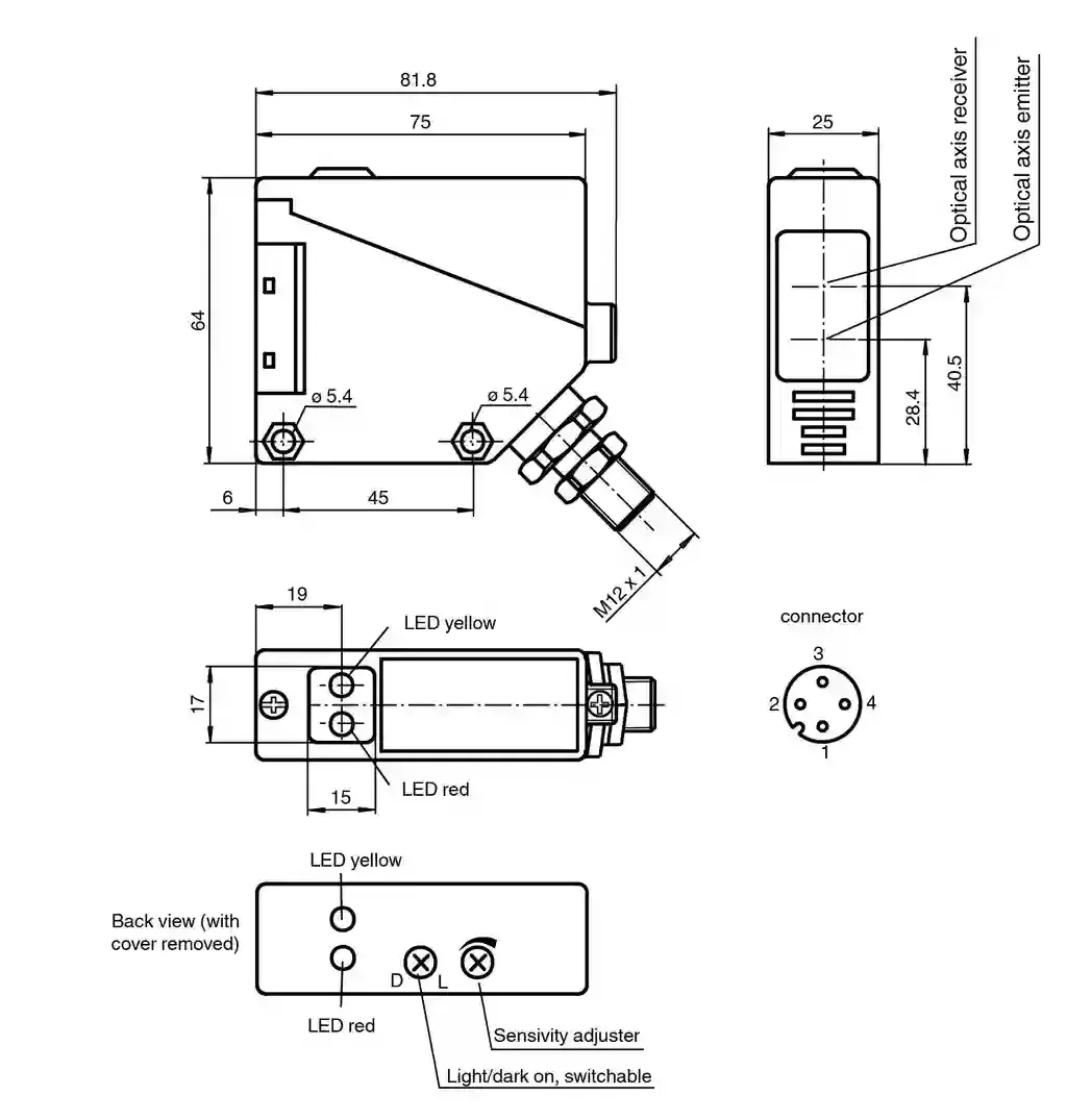 Retroreflective sensor. Retroreflective sensor for standard applications, polarization filter, detection range 12 m, red light, sensitivity adjuster, light/dark on, prefault output, PNP output, M12 plug, Glare protected with polarization filter, Visible red light, Light-on/dark-on, switchable, Degree of protection IP54. Effective detection range: 0 … 5 m. Reflector distance: 0.1 … 5 m. Threshold detection range: 6 m. Reference target: H50 reflector. Light source: LED red. Light type: modulated visible red light. Polarization filter: yes. Ambient light limit: IEC / EN 60947-5-2 , 10000 Lux. MTTFd: 800 a. Mission Time (TM): 20 a. Diagnostic Coverage (DC): 0 %. Function indicator: LED yellow: switching stateLED red: pre-fault indication. Control elements: Sensing range adjuster, light-on/dark-on changeover switch. Operating voltage: 10 … 30 V DC. Ripple: 10 %. No-load supply current: ≤ 20 mA. Time delay before availability: ≤ 300 ms. Stability alarm output: 1 PNP, active when falling short of operating reserve. Switching type: light/dark on. Signal output: 1 PNP output, short-circuit protected, reverse polarity protected, open collector. Switching voltage: max. 30 V DC. Switching current: max. 200 mA , resistive load. Voltage drop: ≤ 3 V. Switching frequency: ≤ 300 Hz. Response time: ≤ 1.5 ms. Product standard: EN 60947-5-2. Approvals: CE. Ambient temperature: -25 … 55 °C (-13 … 131 °F). Storage temperature: -40 … 70 °C (-40 … 158 °F). Degree of protection: IP54. Connection: 4-pin, M12 x 1 connector. Material: . HousingPBTOptical facePMMA: . Housing: PBT. Optical face: PMMA. Mass: approx. 100 g. Dimensions: . Height64 mmWidth25 mmDepth75 mm: . Height: 64 mm. Width: 25 mm. Depth: 75 mm. Scope of delivery: Reflector