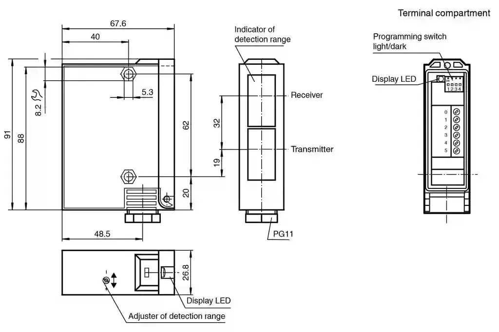Background suppression sensor. Background suppression sensor, Adjustable background suppression, Visible red light, Sturdy plastic housing, Optical surface made of scratch-resistant glass. Detection range: 50 … 500 mm. Detection range min.: 50 … 150 mm. Detection range max.: 50 … 500 mm. Light source: LED. Light type: modulated visible red light. Black-white difference (6 %/90 %): < 5 %. Diameter of the light spot: 12 mm at 500 mm sensor range. Opening angle: 1.5 °. Ambient light limit: 12000 Lux. MTTFd: 850 a. Mission Time (TM): 20 a. Diagnostic Coverage (DC): 0 %. Function indicator: LED yellow, lights up with receiver lit. Control elements: Programming switch for light/dark switching. Control elements: Sensing range adjuster. Operating voltage: 12 … 240 V AC/DC (automatic adaption to +UB). Power consumption: 3 VA. Switching type: light/dark on switchable. Signal output: 1 relay, 1 alternator. Switching voltage: max. 240 V AC. Switching current: max. 2 A. Switching frequency: 10 Hz. Response time: 50 ms. Product standard: EN 60947-5-2. UL approval: cULus. CCC approval: Certified by China Compulsory Certification (CCC). Ambient temperature: -20 … 60 °C (-4 … 140 °F). Storage temperature: -20 … 75 °C (-4 … 167 °F). Degree of protection: IP65. Connection: terminal compartment. Material: . HousingTerluran® GV15Optical faceglass: . Housing: Terluran® GV15. Optical face: glass. Mass: 180 g. Dimensions: . Height91 mmWidth26.8 mmDepth67.6 mm: . Height: 91 mm. Width: 26.8 mm. Depth: 67.6 mm