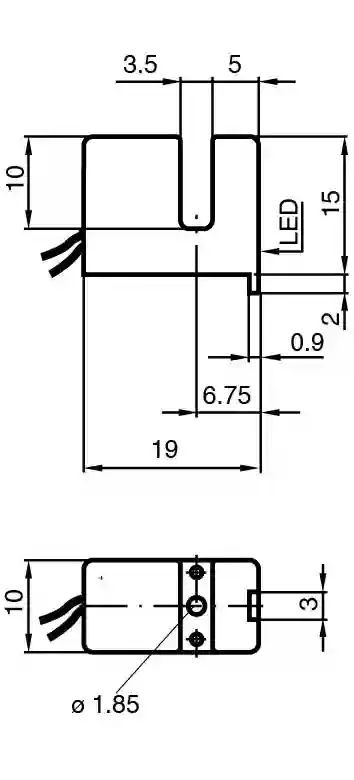Inductive slot sensor. Switching function: Normally open (NO), Output type: PNP, Output polarity: DC, Output type: 3-wire, Construction type: Slot, Series: Slot type, Operating voltage: 10 … 30 V DC, Type of voltage: DC, Connection type: flexible leads LiY , 500 mm, Housing material: PBT, Degree of protection: IP67. Switching function: Normally open (NO). Output type: PNP. Slot width: 3.5 mm. Depth of immersion (lateral): 5 … 7 mm. Output polarity: DC. Output type: 3-wire. Operating voltage: 10 … 30 V DC. Switching frequency: 0 … 3000 Hz. Hysteresis: 0 … 0.6 mm. Reverse polarity protection: reverse polarity protected. Short-circuit protection: pulsing. Voltage drop: ≤ 3 V. Operating current: 0 … 100 mA. No-load supply current: ≤ 7 mA. Switching state indicator: LED, yellow. MTTFd: 2590 a. Mission Time (TM): 20 a. Diagnostic Coverage (DC): 0 %. Standard conformity: . StandardsEN IEC 60947-5-2: . Standards: EN IEC 60947-5-2. UL approval: cULus Listed Load Type: General Purpose Circuitry: Class 2 Power Source Enclosure Type Rating: Type 1 Supply/Switching Voltage: 30 V DC Output Switching Current: 100 mA. CCC approval: CCC approval / marking not required for products rated ≤36 V. Ambient temperature: -25 … 70 °C (-13 … 158 °F). Connection type: flexible leads LiY , 500 mm. Core cross section: 0.14 mm2. Housing material: PBT. Degree of protection: IP67. Dimensions: . Height15 mmWidth10 mmLength19.5 mm: . Height: 15 mm. Width: 10 mm. Length: 19.5 mm