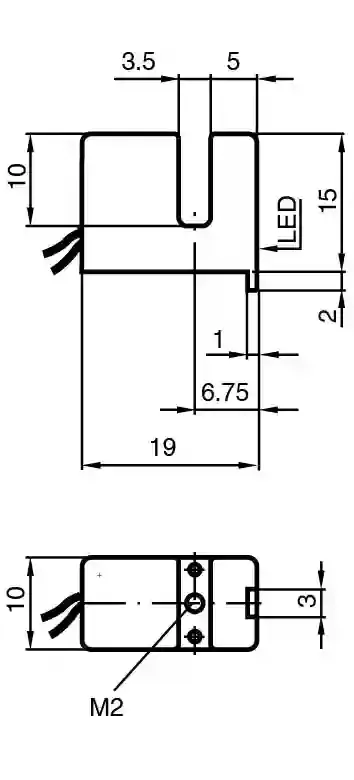 Inductive slot sensor. Switching function: Normally open (NO), Output type: PNP, Output polarity: DC, Output type: 3-wire, Construction type: Slot, Series: Slot type, Operating voltage: 10 … 30 V DC, Type of voltage: DC, Connection type: flexible leads PVC , 135 mm, Housing material: PBT, Degree of protection: IP67. Switching function: Normally open (NO). Output type: PNP. Slot width: 3.5 mm. Depth of immersion (lateral): 5 … 7 mm. Output polarity: DC. Output type: 3-wire. Operating voltage: 10 … 30 V DC. Switching frequency: 0 … 2000 Hz. Reverse polarity protection: reverse polarity protected. Short-circuit protection: pulsing. Voltage drop: ≤ 3 V. Operating current: 0 … 100 mA. No-load supply current: ≤ 15 mA. Switching state indicator: LED, yellow. MTTFd: 2590 a. Mission Time (TM): 20 a. Diagnostic Coverage (DC): 0 %. Standard conformity: . StandardsEN IEC 60947-5-2: . Standards: EN IEC 60947-5-2. UL approval: cULus Listed Load Type: General Purpose Circuitry: Class 2 Power Source Enclosure Type Rating: Type 1 Supply/Switching Voltage: 30 V DC Output Switching Current: 100 mA. CCC approval: CCC approval / marking not required for products rated ≤36 V. Ambient temperature: -25 … 70 °C (-13 … 158 °F). Connection type: flexible leads PVC , 135 mm. Core cross section: 0.14 mm2. Housing material: PBT. Degree of protection: IP67. Dimensions: . Height15 mmWidth10 mmLength19.5 mm: . Height: 15 mm. Width: 10 mm. Length: 19.5 mm