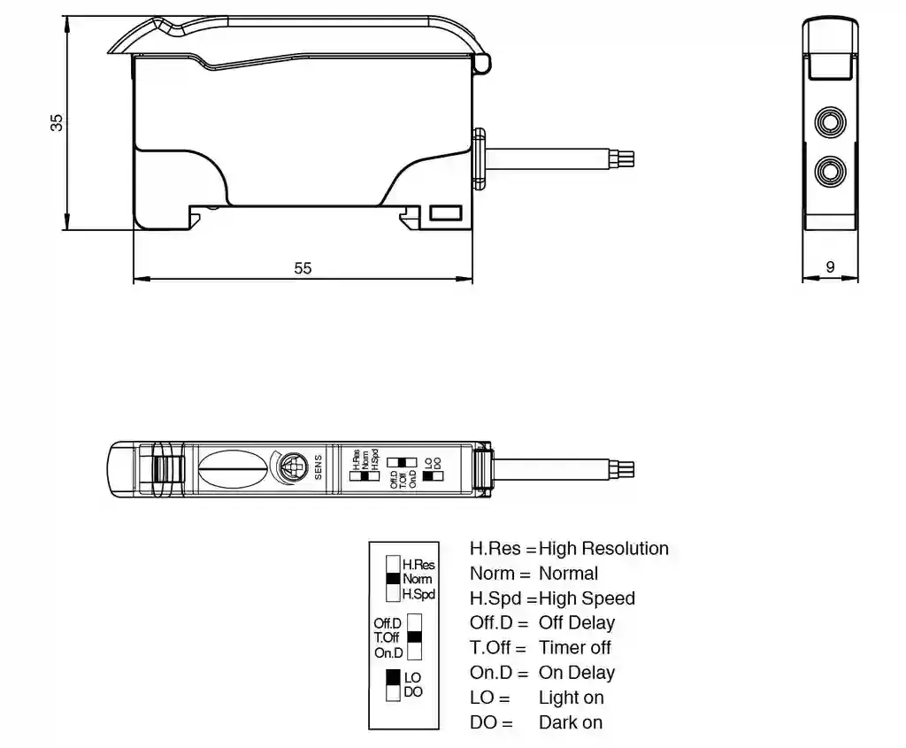 | Control elements | Potentiometer for setting sensitivity slide switch 2 positions: light/dark switching slide switch 3 positions: timer function - timer off, on delay 40 ms, off-delay 40 ms slide switch 3 positions: operating mode - normal, high speed , high resolution |