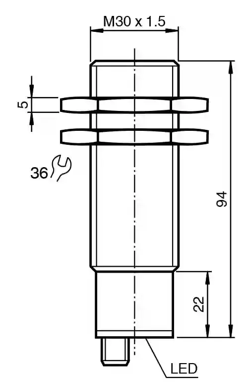 Ultrasonic sensor. Single head system, Switching output, 5 different output functions can be set, Program input, Series: UB-30GM, Operating voltage: 10 … 30 V DC , ripple 10 %SS, Output type: 1 switch output PNP , Normally open/closed , programmable, UL approval: cULus Listed, General Purpose, CCC approval: CCC approval / marking not required for products rated ≤36 V, Connection type: Connector plug M12 x 1 , 5-pin, Housing: nickel plated brass; plastic components: PBT. Sensing range: 80 … 2000 mm. Adjustment range: 120 … 2000 mm. Dead band: 0 … 80 mm. Standard target plate: 100 mm x 100 mm. Transducer frequency: approx. 180 kHz. Response delay: approx. 150 ms. LED green: solid: Power-onflashing: program function object detected. LED yellow: solid: switching state switch outputflashing: program function. LED red: normal operation: “fault”program function: no object detected. Operating voltage: 10 … 30 V DC , ripple 10 %SS. No-load supply current: ≤ 50 mA. Synchronization: bi-directional0 level -UB…+1 V1 level: +4 V…+UB input impedance: > 12 KOhmsynchronization pulse: ≥ 100 µs, synchronization interpulse period: ≥ 2 ms. Synchronization frequency: . Common mode operationmax. 30 HzMultiplex operation≤ 30 Hz / n , n = number of sensors , n ≤ 5: . Common mode operation: max. 30 Hz. Multiplex operation: ≤ 30 Hz / n , n = number of sensors , n ≤ 5. Input type: 1 program input,operating range 1: -UB … +1 V, operating range 2: +4 V … +UB input impedance: > 4.7 kΩ; program pulse: ≥ 1 s. Output type: 1 switch output PNP , Normally open/closed , programmable. Rated operating current: 200 mA , short-circuit/overload protected. Voltage drop: ≤ 2.5 V. Repeat accuracy: ≤ 0.5 % of switching point. Switching frequency: ≤ 3.3 Hz. Range hysteresis: 1 % of the set operating distance. Temperature influence: < 2 % of far switch point. Standard conformity: . StandardsEN IEC 60947-5-2:2020 IEC 60947-5-2:2019: . Standards: EN IEC 60947-5-2:2020 IEC 60947-5-2:2019. UL approval: cULus Listed, General Purpose. CCC approval: CCC approval / marking not required for products rated ≤36 V. Ambient temperature: -25 … 70 °C (-13 … 158 °F). Storage temperature: -40 … 85 °C (-40 … 185 °F). Connection type: Connector plug M12 x 1 , 5-pin. Degree of protection: IP65. Material: . Housingnickel plated brass; plastic components: PBTTransducerepoxy resin/hollow glass sphere mixture; polyurethane foam: . Housing: nickel plated brass; plastic components: PBT. Transducer: epoxy resin/hollow glass sphere mixture; polyurethane foam. Mass: 140 g. Dimensions: . Length94 mmDiameter30 mm: . Length: 94 mm. Diameter: 30 mm. Output: Switch point A1: 220 mm Switch point A2: 2100 mm output function: Window mode output behavior: NO contact