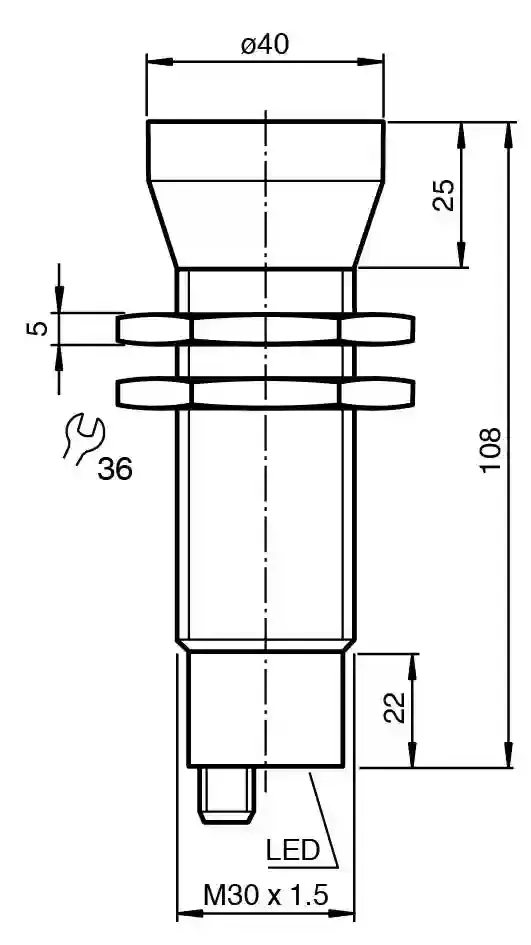 Ultrasonic sensor. Single head system, Switching output, 5 different output functions can be set, Program input, Series: UB-30GM, Operating voltage: 10 … 30 V DC , ripple 10 %SS, Output type: 1 switch output PNP , Normally open/closed , programmable, UL approval: cULus Listed, General Purpose, CCC approval: CCC approval / marking not required for products rated ≤36 V, Connection type: Connector plug M12 x 1 , 5-pin, Housing: nickel plated brass; plastic components: PBT. Sensing range: 200 … 4000 mm. Adjustment range: 240 … 4000 mm. Dead band: 0 … 200 mm. Standard target plate: 100 mm x 100 mm. Transducer frequency: approx. 85 kHz. Response delay: approx. 325 ms. LED green: solid: Power-onflashing: program function object detected. LED yellow: solid: switching state switch outputflashing: program function. LED red: normal operation: “fault”program function: no object detected. Operating voltage: 10 … 30 V DC , ripple 10 %SS. No-load supply current: ≤ 50 mA. Synchronization: bi-directional0 level -UB…+1 V1 level: +4 V…+UB input impedance: > 12 KOhmsynchronization pulse: ≥ 100 µs, synchronization interpulse period: ≥ 2 ms. Synchronization frequency: . Common mode operationmax. 13 HzMultiplex operation≤ 13 Hz / n , n = number of sensors , n ≤ 5: . Common mode operation: max. 13 Hz. Multiplex operation: ≤ 13 Hz / n , n = number of sensors , n ≤ 5. Input type: 1 program input,operating range 1: -UB … +1 V, operating range 2: +4 V … +UB input impedance: > 4.7 kΩ; program pulse: ≥ 1 s. Output type: 1 switch output PNP , Normally open/closed , programmable. Rated operating current: 200 mA , short-circuit/overload protected. Voltage drop: ≤ 2.5 V. Repeat accuracy: ≤ 0.5 % of switching point. Switching frequency: ≤ 1.5 Hz. Range hysteresis: 1 % of the set operating distance. Temperature influence: < 2 % of far switch point. Standard conformity: . StandardsEN IEC 60947-5-2:2020 IEC 60947-5-2:2019: . Standards: EN IEC 60947-5-2:2020 IEC 60947-5-2:2019. UL approval: cULus Listed, General Purpose. CCC approval: CCC approval / marking not required for products rated ≤36 V. Ambient temperature: -25 … 70 °C (-13 … 158 °F). Storage temperature: -40 … 85 °C (-40 … 185 °F). Connection type: Connector plug M12 x 1 , 5-pin. Degree of protection: IP65. Material: . Housingnickel plated brass; plastic components: PBTTransducerepoxy resin/hollow glass sphere mixture; polyurethane foam: . Housing: nickel plated brass; plastic components: PBT. Transducer: epoxy resin/hollow glass sphere mixture; polyurethane foam. Mass: 180 g. Dimensions: . Length108 mmDiameter40 mm: . Length: 108 mm. Diameter: 40 mm. Output: Switch point A1: 550 mm Switch point A2: 4200 mm output function: Window mode output behavior: NO contact
