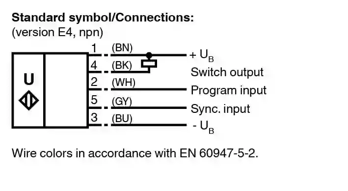 Ultrasonic sensor. Single head system, Switching output, Extremely small unusable area, TEACH-IN, Series: UB-F42, Operating voltage: 10 … 30 V DC , ripple 10 %SS, Output type: 1 switching output E4, NPN, NO/NC, programmable, UL approval: cULus Listed, Class 2 Power Source, CCC approval: CCC approval / marking not required for products rated ≤36 V, Connection type: Connector plug M12 x 1 , 5-pin, Housing: ABS. Sensing range: 350 … 6000 mm. Adjustment range: 400 … 6000 mm. Dead band: 0 … 350 mm. Standard target plate: 100 mm x 100 mm. Transducer frequency: approx. 65 kHz. Response delay: approx. 650 ms. LED green: solid green: Power on. LED yellow: solid: switching state switch outputflashing: program function. LED red: normal operation: “fault”program function: no object detected. Operating voltage: 10 … 30 V DC , ripple 10 %SS. No-load supply current: ≤ 60 mA. Synchronization: bi-directional0 level -UB…+1 V1 level: +4 V…+UB input impedance: > 12 KOhmsynchronization pulse: ≥ 100 µs, synchronization interpulse period: ≥ 2 ms. Synchronization frequency: . Common mode operationmax. 7 HzMultiplex operation≤ 7/n Hz, n = number of sensors: . Common mode operation: max. 7 Hz. Multiplex operation: ≤ 7/n Hz, n = number of sensors. Output type: 1 switching output E4, NPN, NO/NC, programmable. Rated operating current: 200 mA , short-circuit/overload protected. Default setting: Switch point A1: 400 mm , Switch point A2: 6000 mm , wide sound lobe. Voltage drop: ≤ 2.5 V. Repeat accuracy: ≤ 0.5 % of switching point. Switching frequency: ≤ 0.6 Hz. Range hysteresis: 1 % of the set operating distance. Temperature influence: ± 1 % of full-scale value. Standard conformity: . StandardsEN IEC 60947-5-2:2020 IEC 60947-5-2:2019: . Standards: EN IEC 60947-5-2:2020 IEC 60947-5-2:2019. UL approval: cULus Listed, Class 2 Power Source. CCC approval: CCC approval / marking not required for products rated ≤36 V. Ambient temperature: -25 … 70 °C (-13 … 158 °F). Storage temperature: -40 … 85 °C (-40 … 185 °F). Connection type: Connector plug M12 x 1 , 5-pin. Degree of protection: IP54. Material: . HousingABSTransducerepoxy resin/hollow glass sphere mixture; foam polyurethane, cover PBT: . Housing: ABS. Transducer: epoxy resin/hollow glass sphere mixture; foam polyurethane, cover PBT. Mass: 210 g. Dimensions: . Height80 mmWidth80 mmLength50 mm: . Height: 80 mm. Width: 80 mm. Length: 50 mm