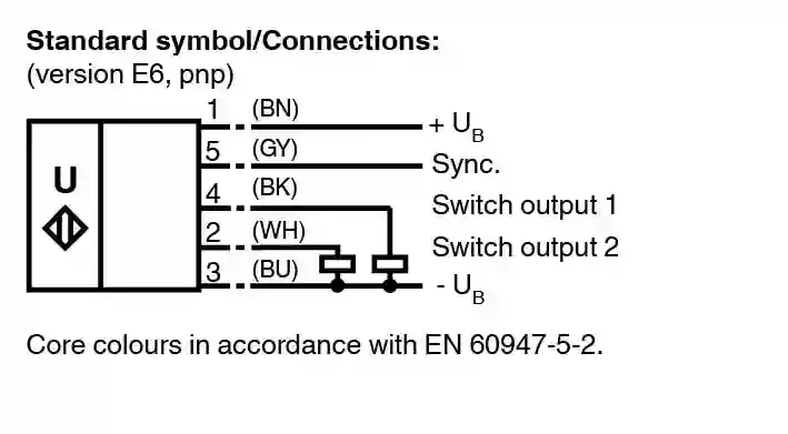 Ultrasonic sensor. Single head system, 2 independent switch outputs, Extremely small unusable area, TEACH-IN, Series: UB-F42, Operating voltage: 10 … 30 V DC , ripple 10 %SS, Output type: 2 switch outputs PNP, NO/NC selectable, UL approval: cULus Listed, Class 2 Power Source, CCC approval: CCC approval / marking not required for products rated ≤36 V, Connection type: Connector plug M12 x 1 , 5-pin, Housing: ABS. Sensing range: 350 … 6000 mm. Adjustment range: 400 … 6000 mm. Dead band: 0 … 350 mm. Standard target plate: 100 mm x 100 mm. Transducer frequency: approx. 65 kHz. Response delay: approx. 650 ms. LED green: solid green: Power on. LED yellow 1: solid: switching state switch output 1flashing: program function. LED yellow 2: solid: switching state switch output 2flashing: program function. LED red: normal operation: “fault”program function: no object detected. Operating voltage: 10 … 30 V DC , ripple 10 %SS. No-load supply current: ≤ 60 mA. Synchronization: bi-directional0 level -UB…+1 V1 level: +4 V…+UB input impedance: > 12 KOhmsynchronization pulse: ≥ 100 µs, synchronization interpulse period: ≥ 2 ms. Synchronization frequency: . Common mode operationmax. 7 HzMultiplex operation≤ 7/n Hz, n = number of sensors: . Common mode operation: max. 7 Hz. Multiplex operation: ≤ 7/n Hz, n = number of sensors. Output type: 2 switch outputs PNP, NO/NC selectable. Rated operating current: 200 mA , short-circuit/overload protected. Default setting: Switch point A1: 400 mm , Switch point A2: 6000 mm , wide sound lobe. Voltage drop: ≤ 2.5 V. Repeat accuracy: ≤ 0.5 % of switching point. Switching frequency: ≤ 0.6 Hz. Range hysteresis: 1 % of the set operating distance. Temperature influence: ± 1 % of full-scale value. Standard conformity: . StandardsEN IEC 60947-5-2:2020 IEC 60947-5-2:2019: . Standards: EN IEC 60947-5-2:2020 IEC 60947-5-2:2019. UL approval: cULus Listed, Class 2 Power Source. CCC approval: CCC approval / marking not required for products rated ≤36 V. Ambient temperature: -25 … 70 °C (-13 … 158 °F). Storage temperature: -40 … 85 °C (-40 … 185 °F). Connection type: Connector plug M12 x 1 , 5-pin. Degree of protection: IP54. Material: . HousingABSTransducerepoxy resin/hollow glass sphere mixture; foam polyurethane, cover PBT: . Housing: ABS. Transducer: epoxy resin/hollow glass sphere mixture; foam polyurethane, cover PBT. Mass: 210 g. Dimensions: . Height80 mmWidth80 mmLength50 mm: . Height: 80 mm. Width: 80 mm. Length: 50 mm